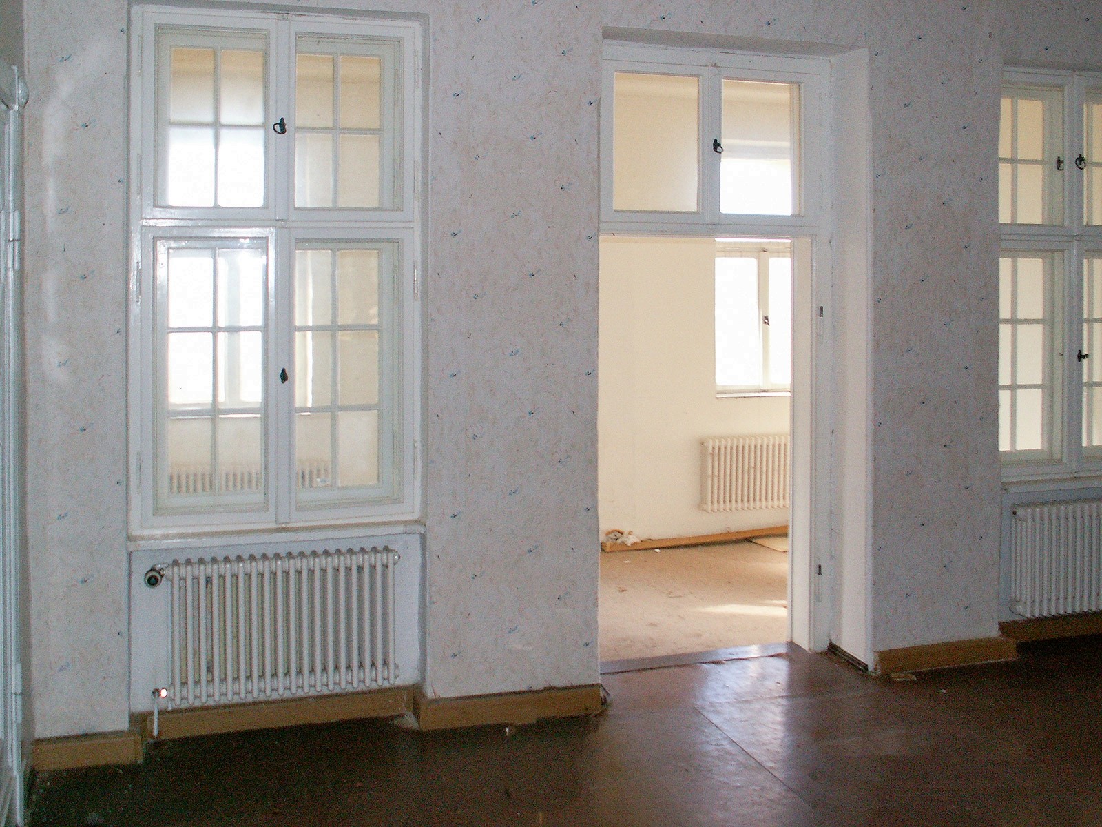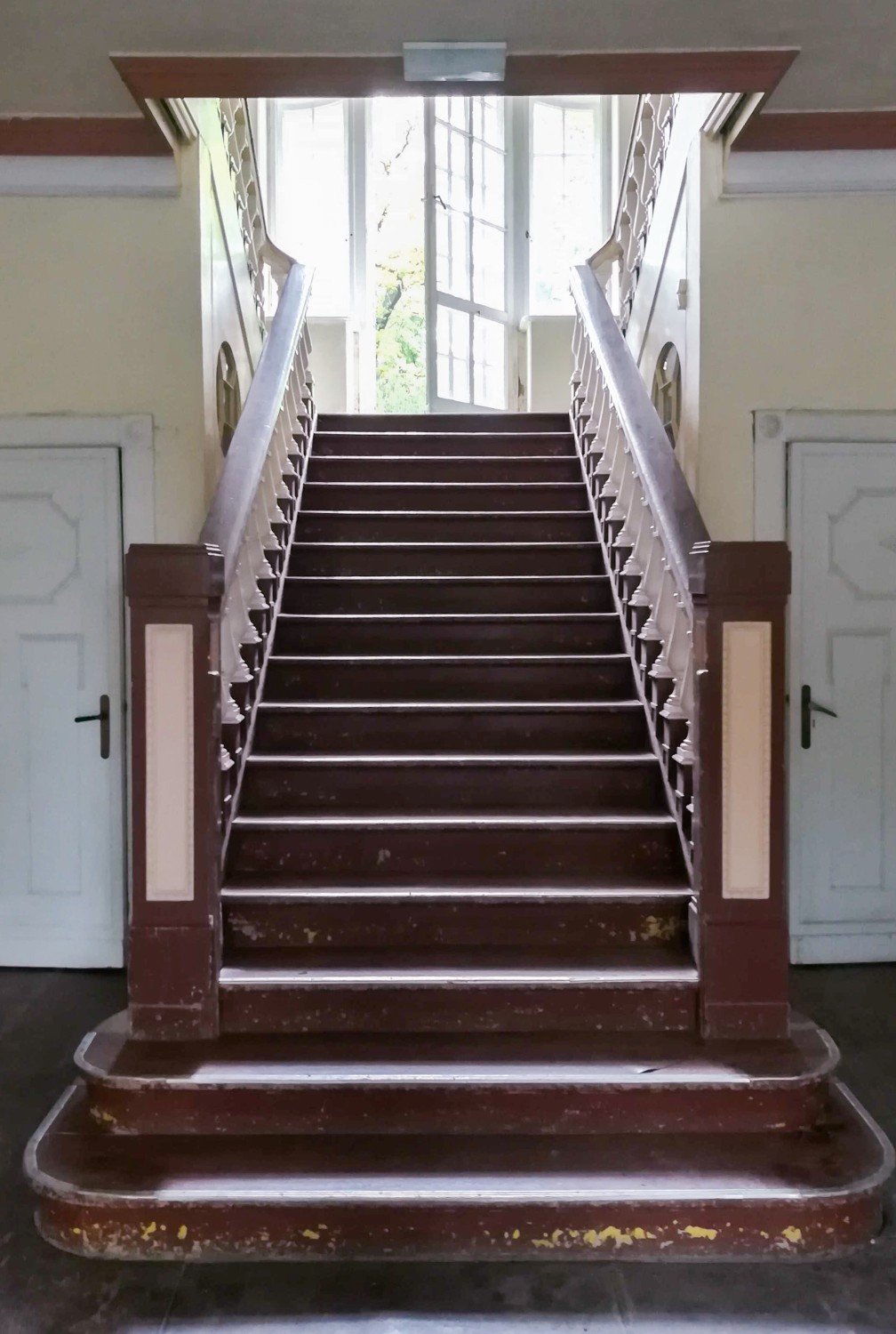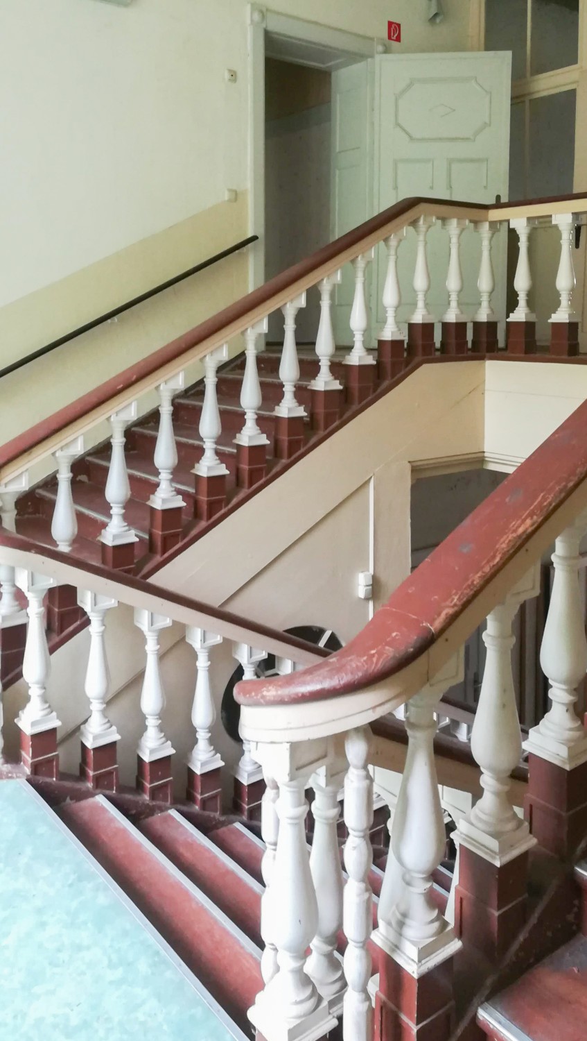 Im Inneren erschließt eine repräsentative zweiläufige Treppe die zentrale Eingangshalle und die angrenzenden Räume im Erd- und Obergeschoss. Eine barocke Stuckdecke ziert den großen Salon im Erdgeschoss. Im Obergeschoss sind originale Schlossdielen erhalten – jahrzehntelang unter Belägen und Holzfaserplatten geschützt und daher in gutem Zustand. Ein zweites Treppenhaus, die sogenannte Gesindetreppe, erschließt das Gebäude von einem Seiteneingang und ermöglicht eine unabhängige Nutzung einzelner Bereiche.