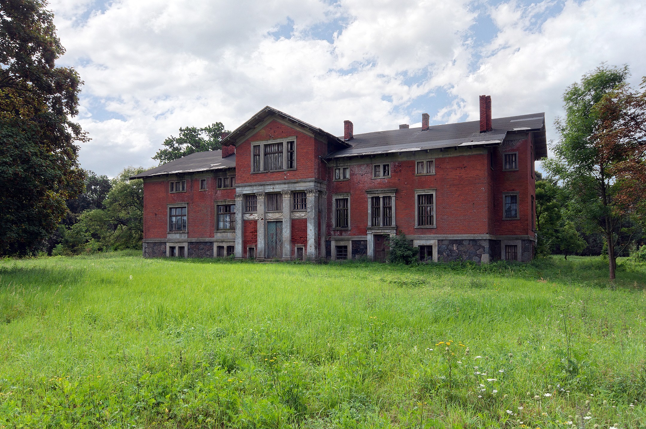 Manoir néoclassique à Bolkowice, construit vers le tournant du siècle en brique sur un soubassement de pierres des champs. Le bâtiment d’un étage, coiffé d’un toit à deux versants, présente un avant-corps saillant avec portique ornemental sur la façade principale ainsi qu’une spacieuse terrasse à colonnes avec escalier extérieur côté parc. La surface utile se répartit sur trois niveaux : sous-sol 422 m², rez-de-chaussée 463 m², étage 455 m² – soit environ 1 340 m² au total. Classé monument historique depuis 1994 (n° A-1270).