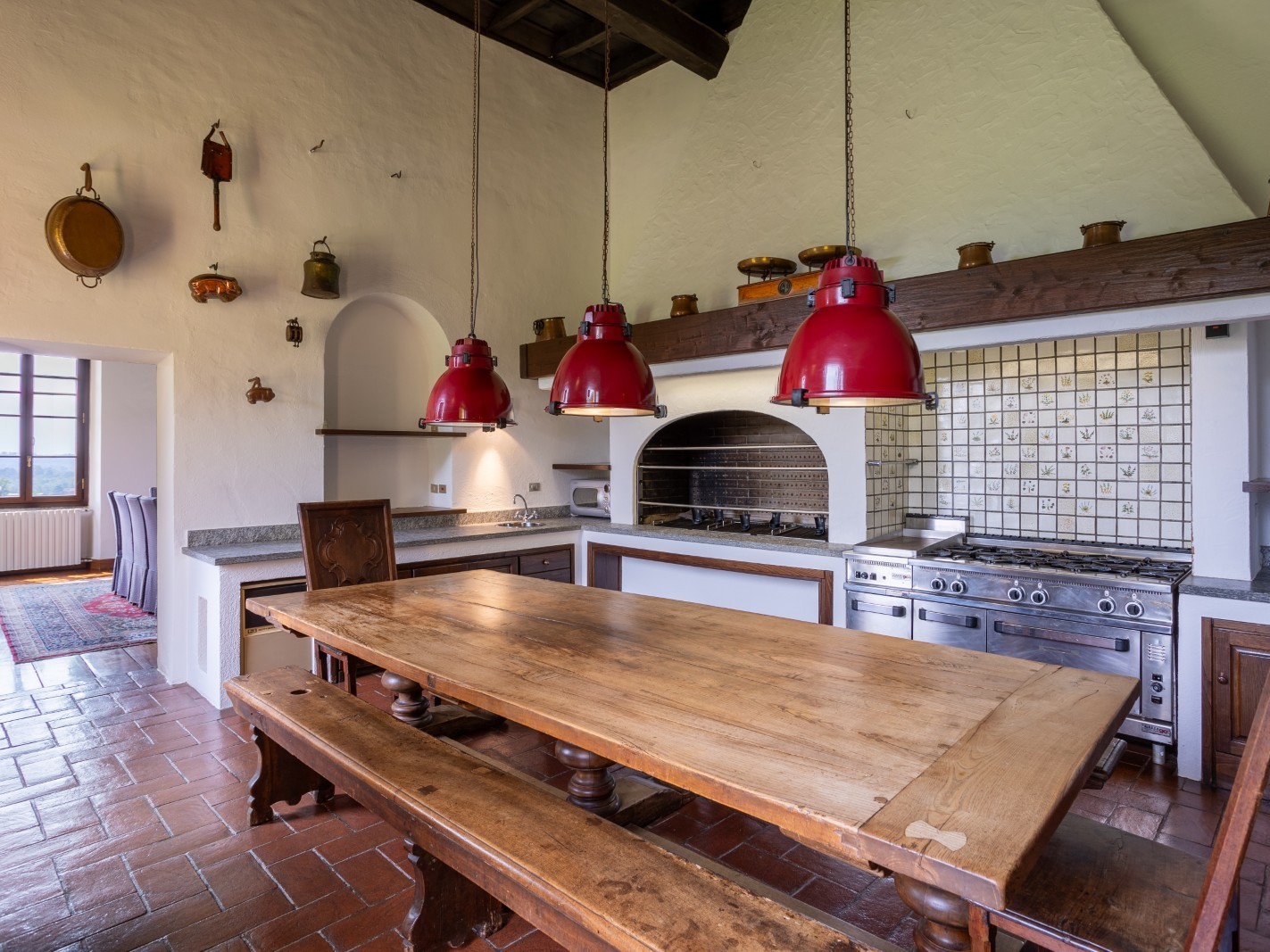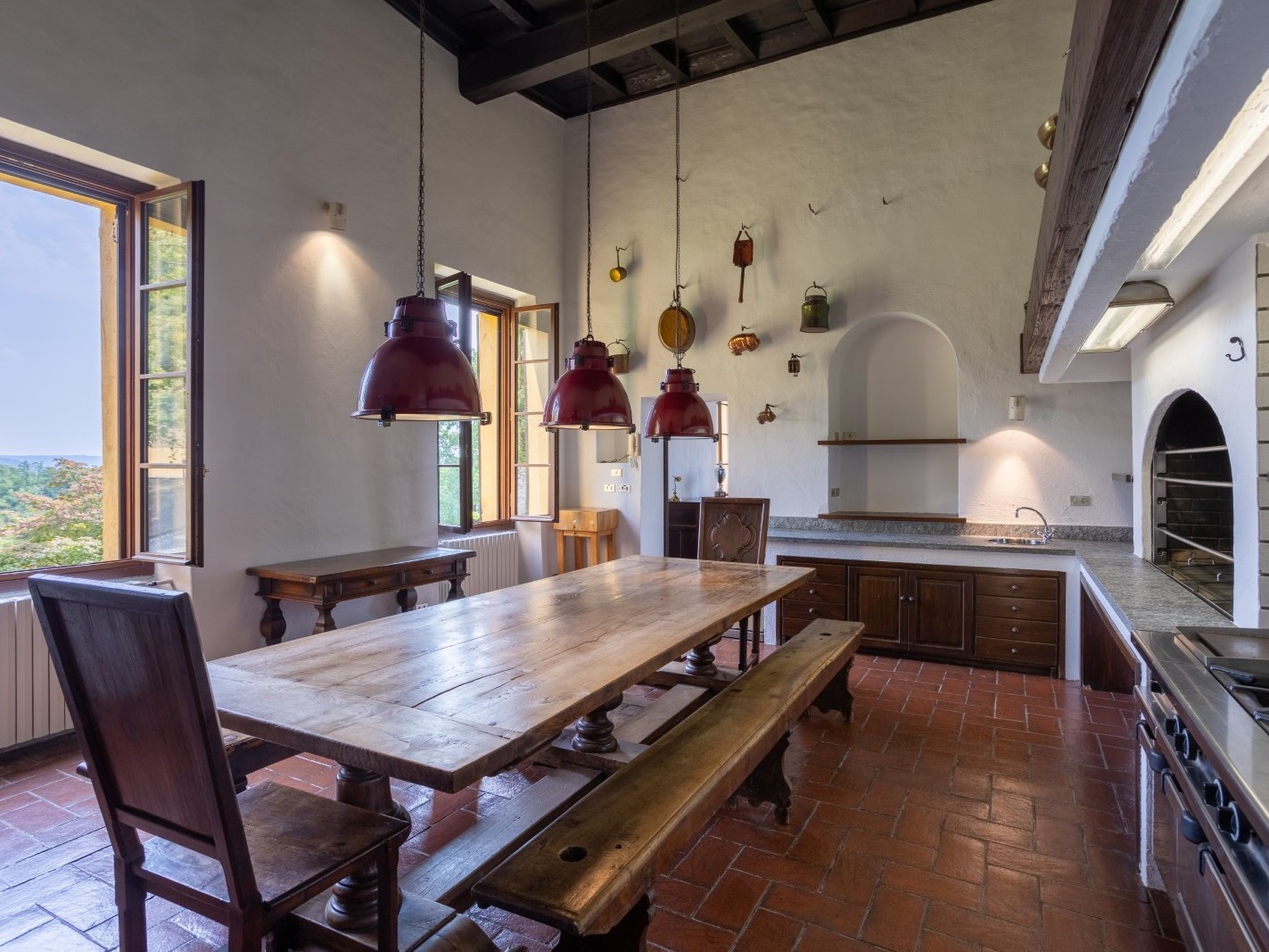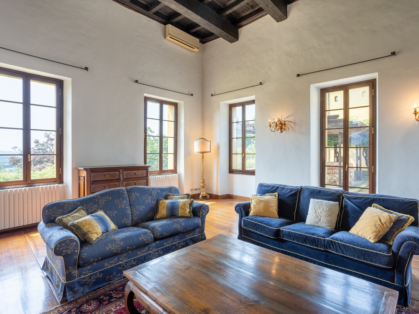 Les intérieurs comprennent de vastes salons dotés de cheminées monumentales, de sols en terre cuite et de poutres apparentes, offrant une atmosphère chaleureuse et élégante. Les huit chambres, toutes avec salle de bains, offrent des espaces lumineux où le confort moderne se combine avec des éléments historiques.