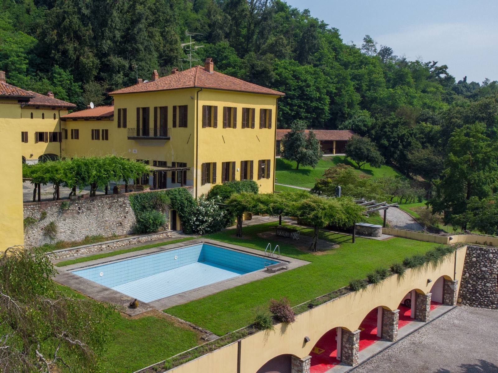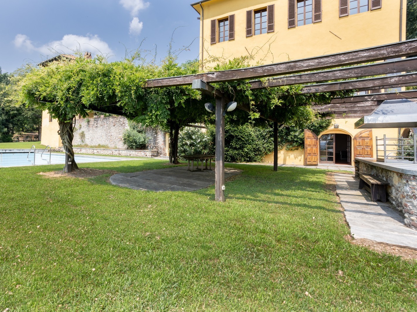 À l’extérieur, la piscine est intégrée au jardin et garantit intimité et tranquillité, tandis que les arcades couvertes et la cuisine extérieure permettent de profiter de repas et de moments conviviaux en plein air. La demeure peut fonctionner à la fois comme résidence principale et comme maison d’hôtes.