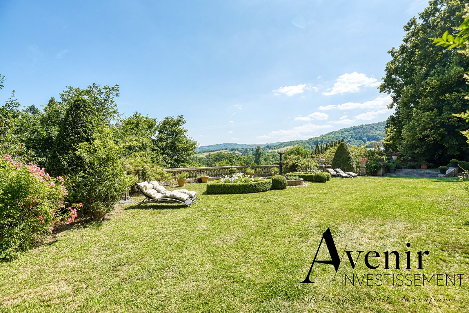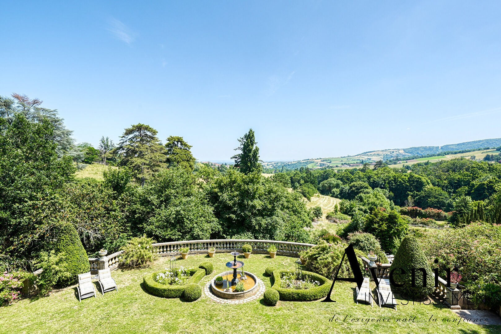 Propriété bourgeoise d’exception élevée sur trois niveaux de 180 m² chacun, sur une parcelle d’environ 8 000 m², avec une très belle vue dégagée sur les Monts du Lyonnais.