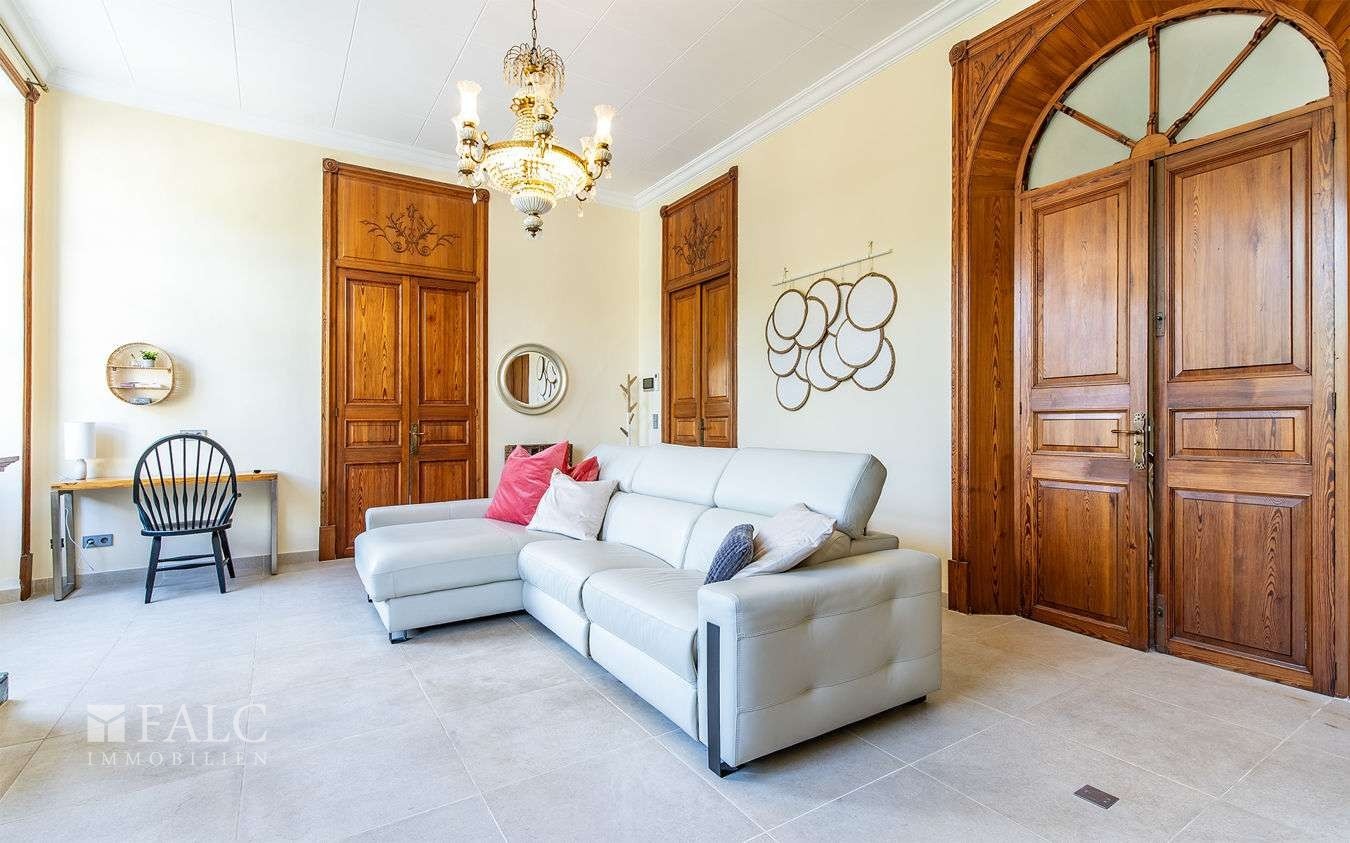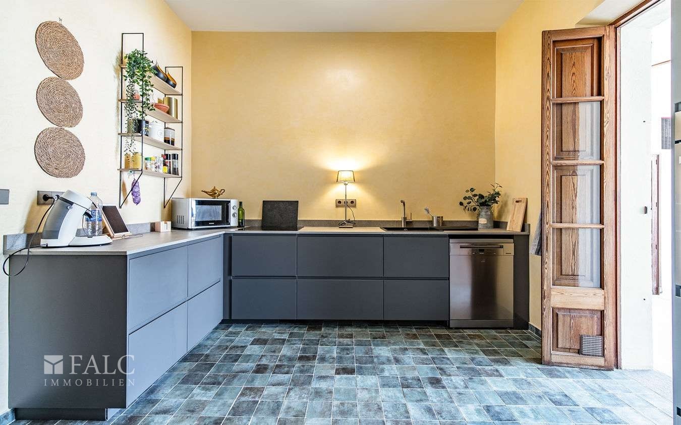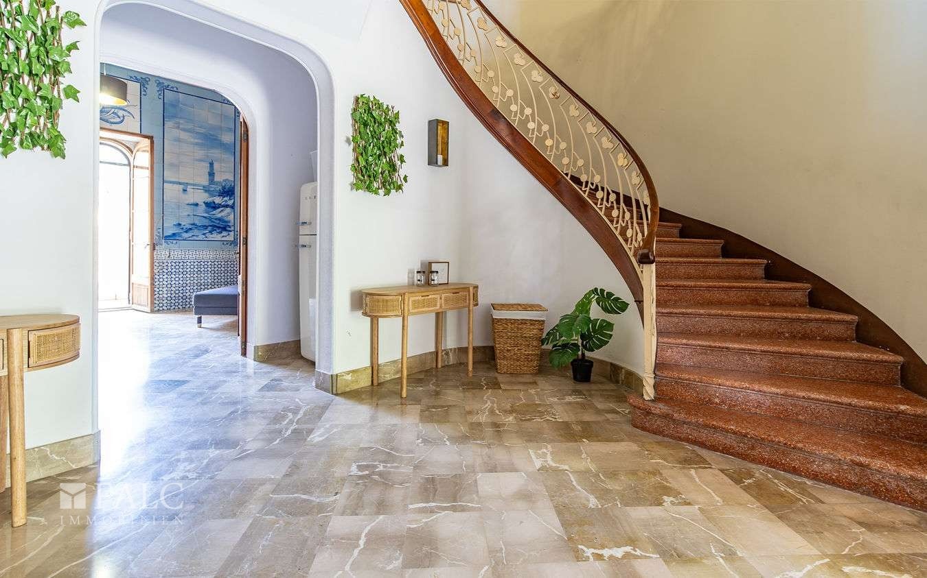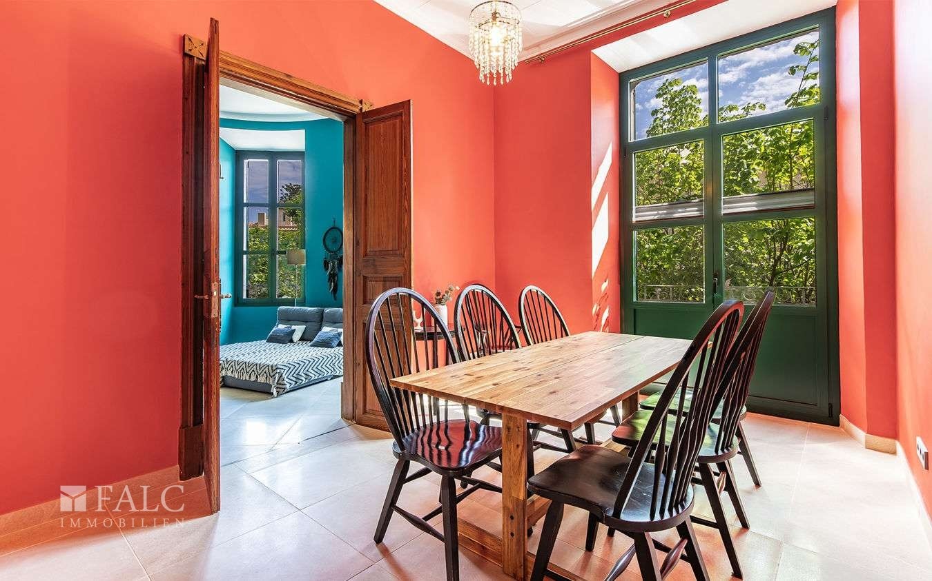 Zur Ausstattung gehören Einbauschränke, Marmor- und Fliesenböden, Klimaanlage in ausgewählten Räumen, historische Holzdeckenbalken unter hohen Decken sowie traditionelle mallorquinische Fensterläden.