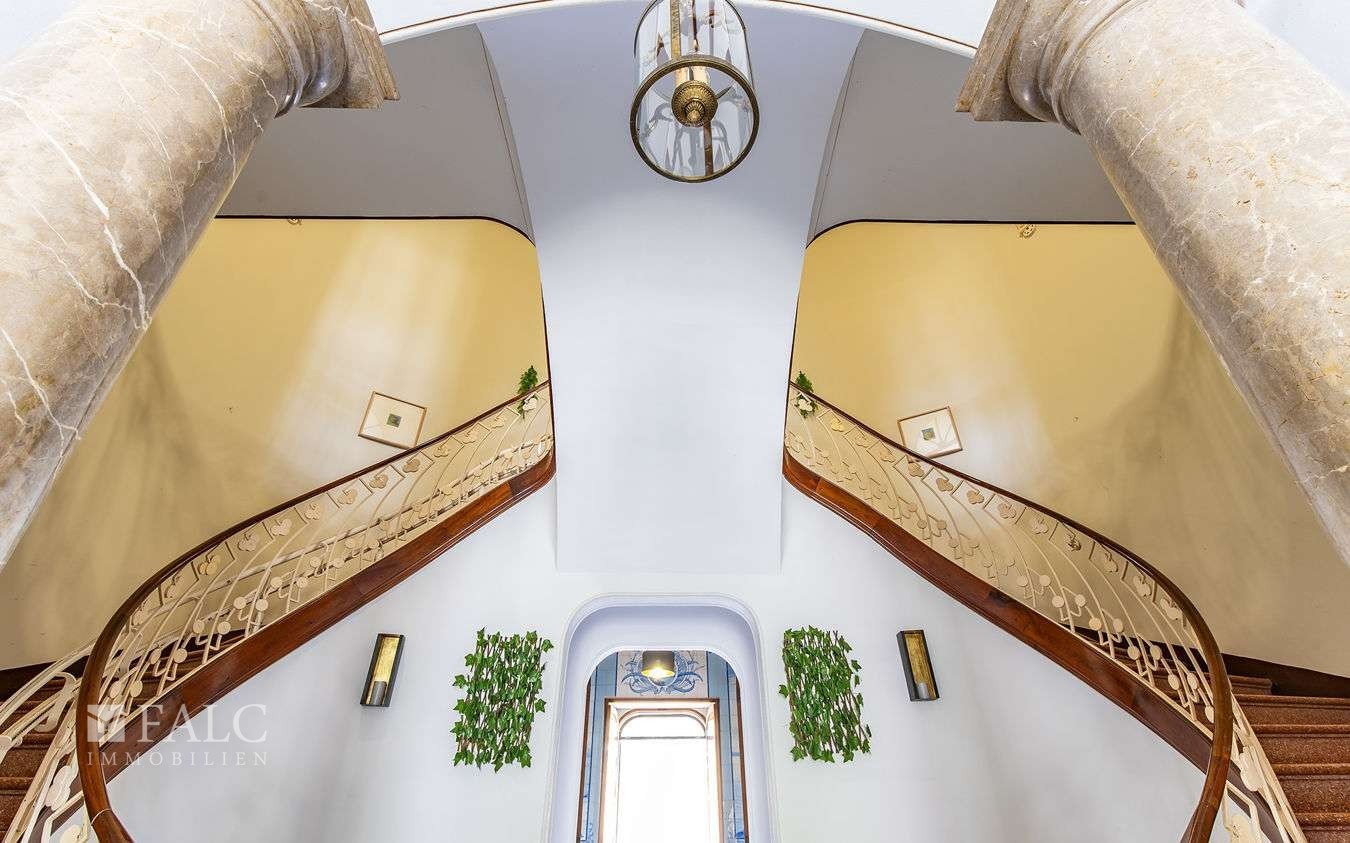Der Eingangsbereich mit Marmorsäulen führt in ein Raumkonzept, das sich über 280 m² auf zwei Etagen plus Kellergeschoss erstreckt. Eine geschwungene Treppe verbindet Erdgeschoss und ersten Stock, wo sich das lichtdurchflutete Wohnzimmer mit Holzkamin und Kronleuchter, das Esszimmer und die Küche befinden.