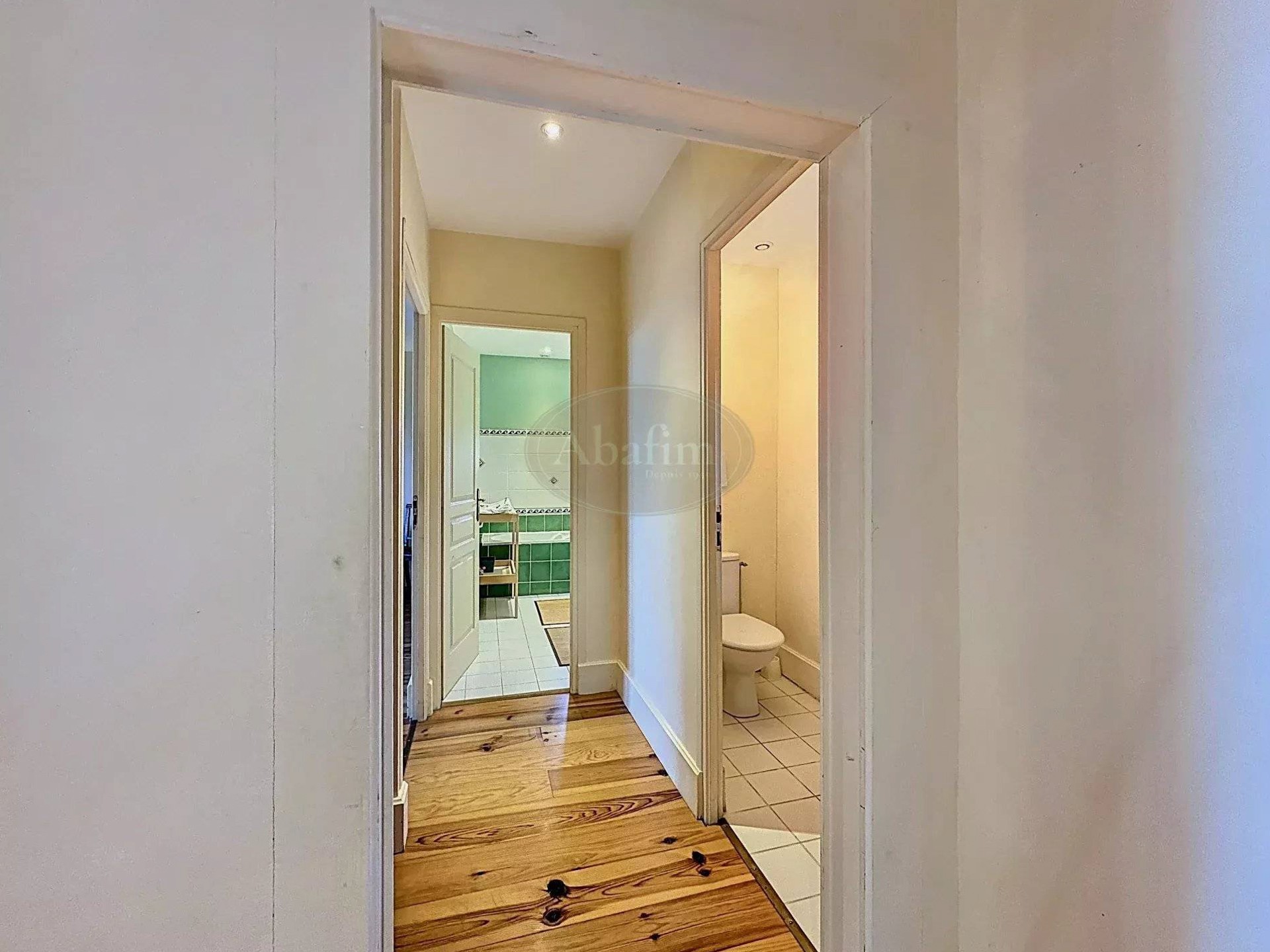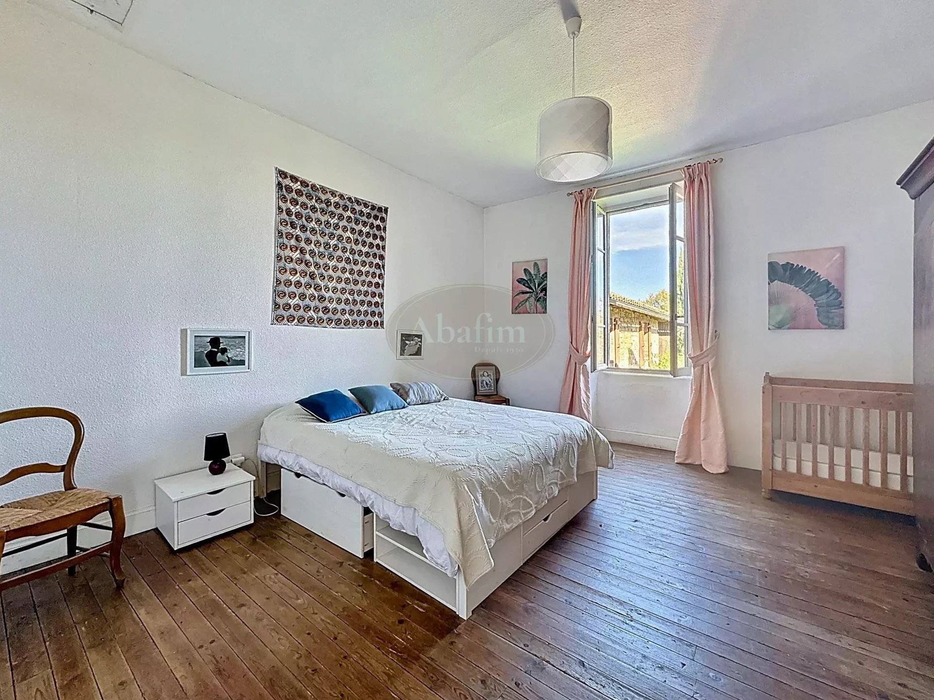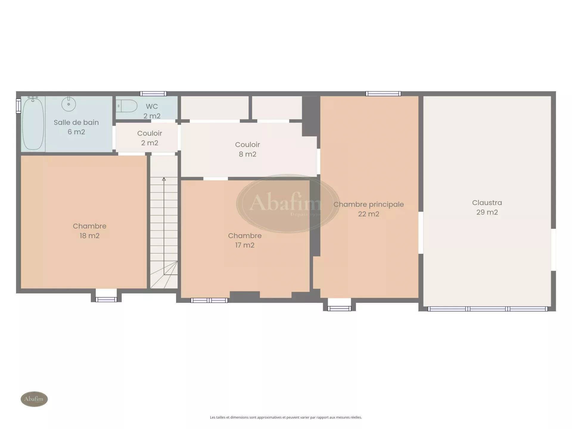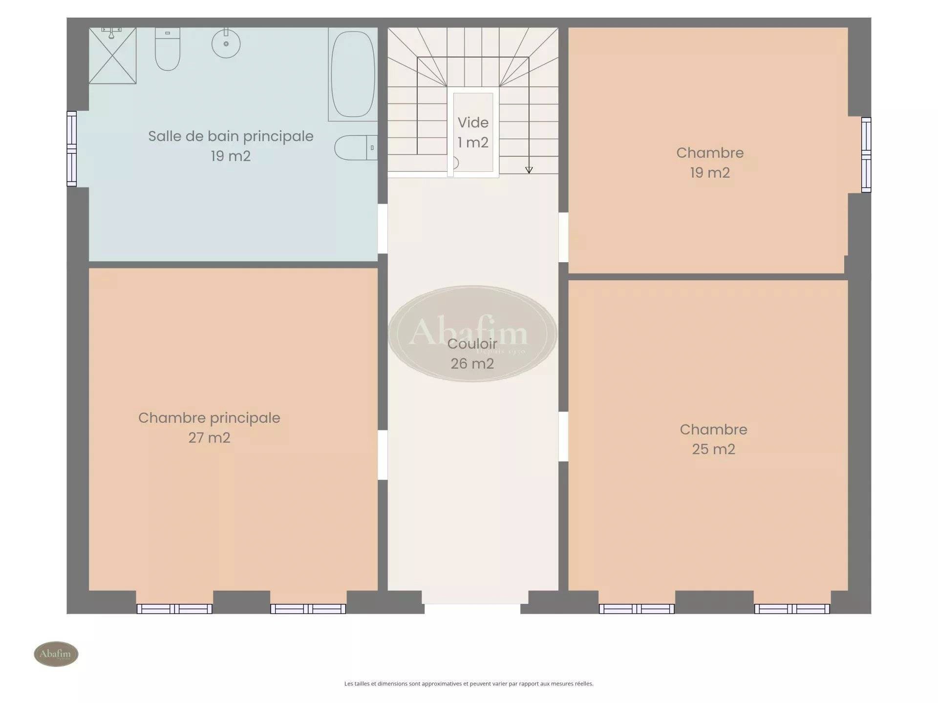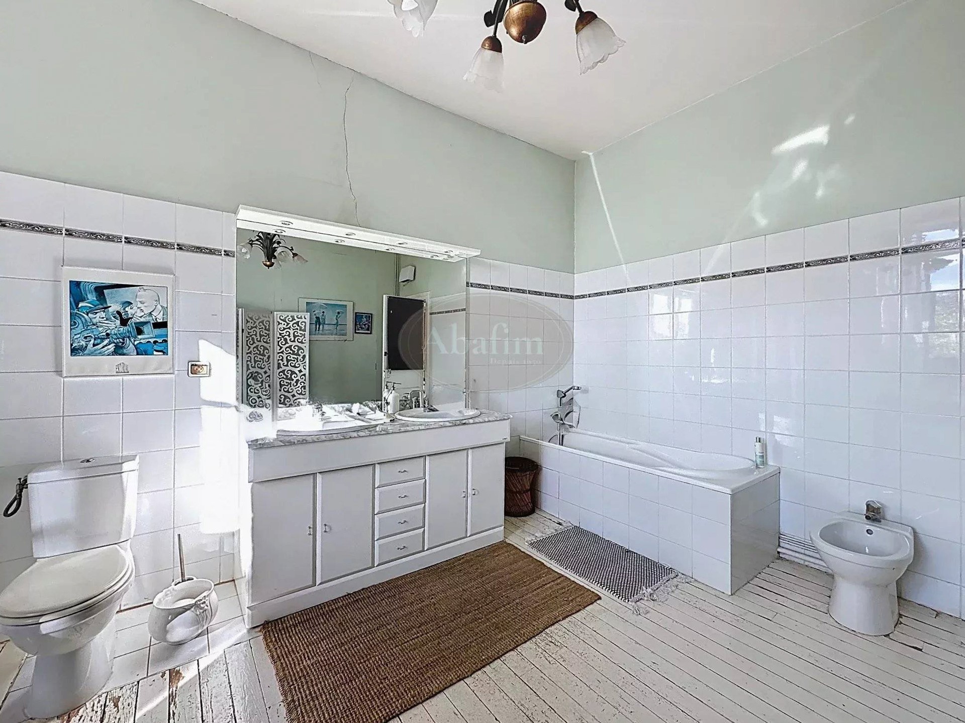 À l’étage, quatre grandes pièces d’environ 20 m² chacune comprennent trois chambres et une grande salle de bains avec douche et baignoire.