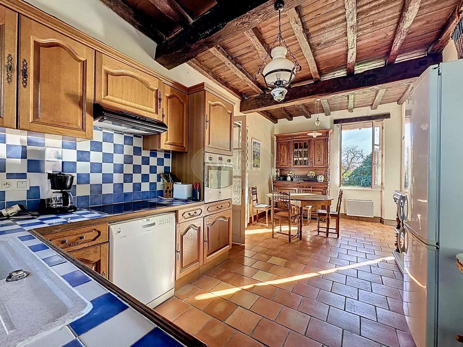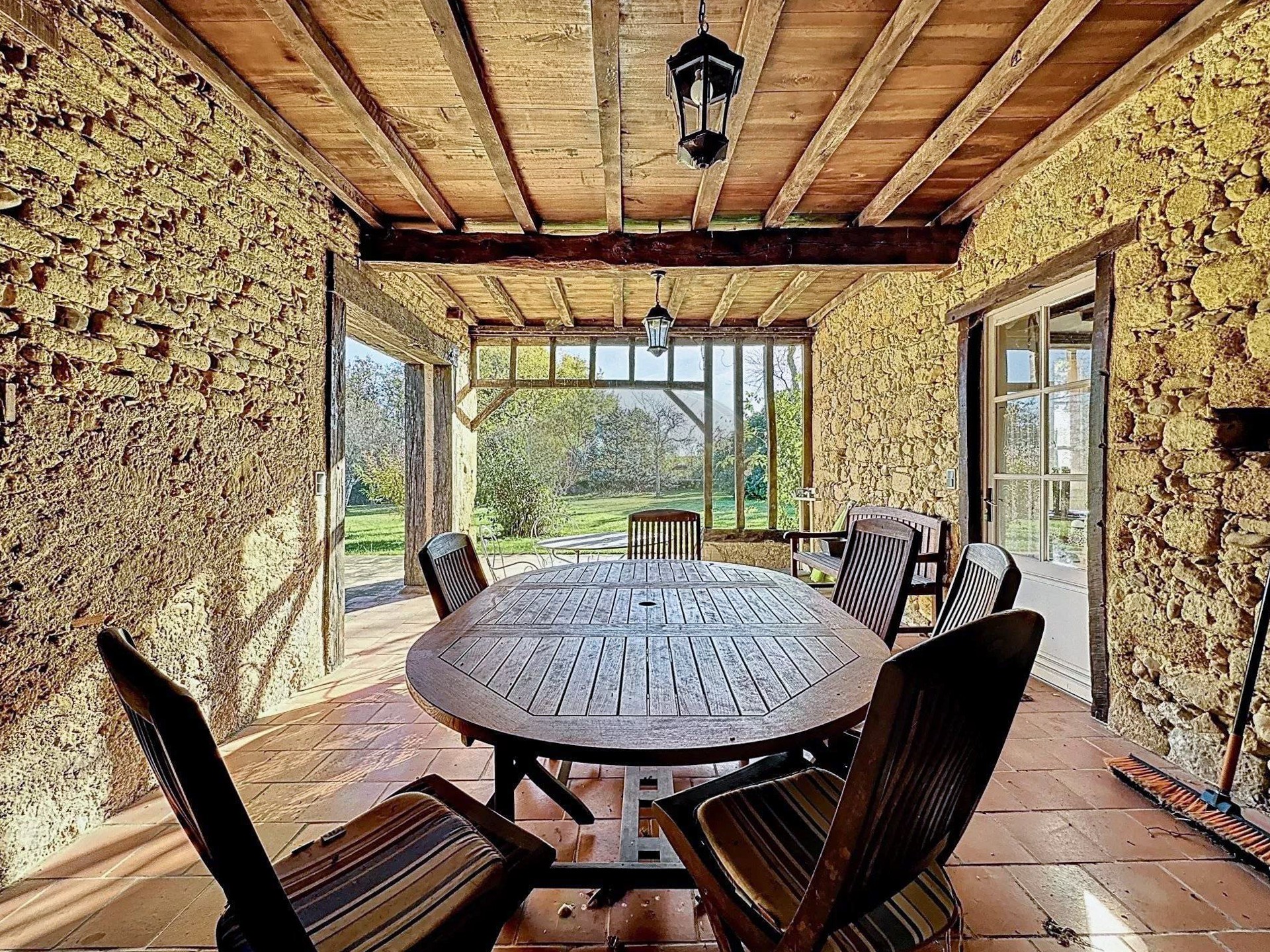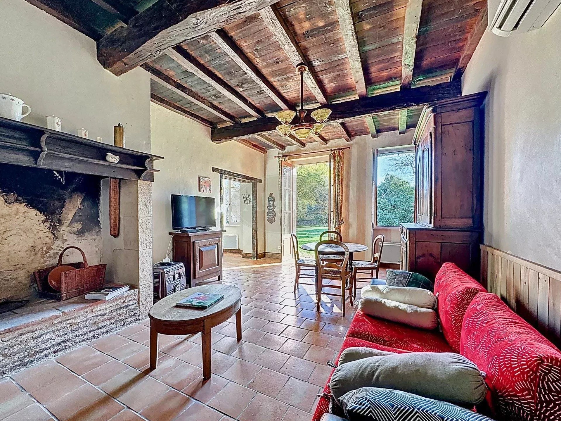 La cuisine et la salle à manger s’ouvrent directement sur la terrasse couverte du rez-de-chaussée. Le grand salon de 34 m² possède une cheminée à foyer ouvert et des portes-fenêtres doubles donnant sur le parc. À l’arrière, un petit dégagement mène à une salle de douche, à des WC séparés et permet de rejoindre la maison de maître par l’intérieur.