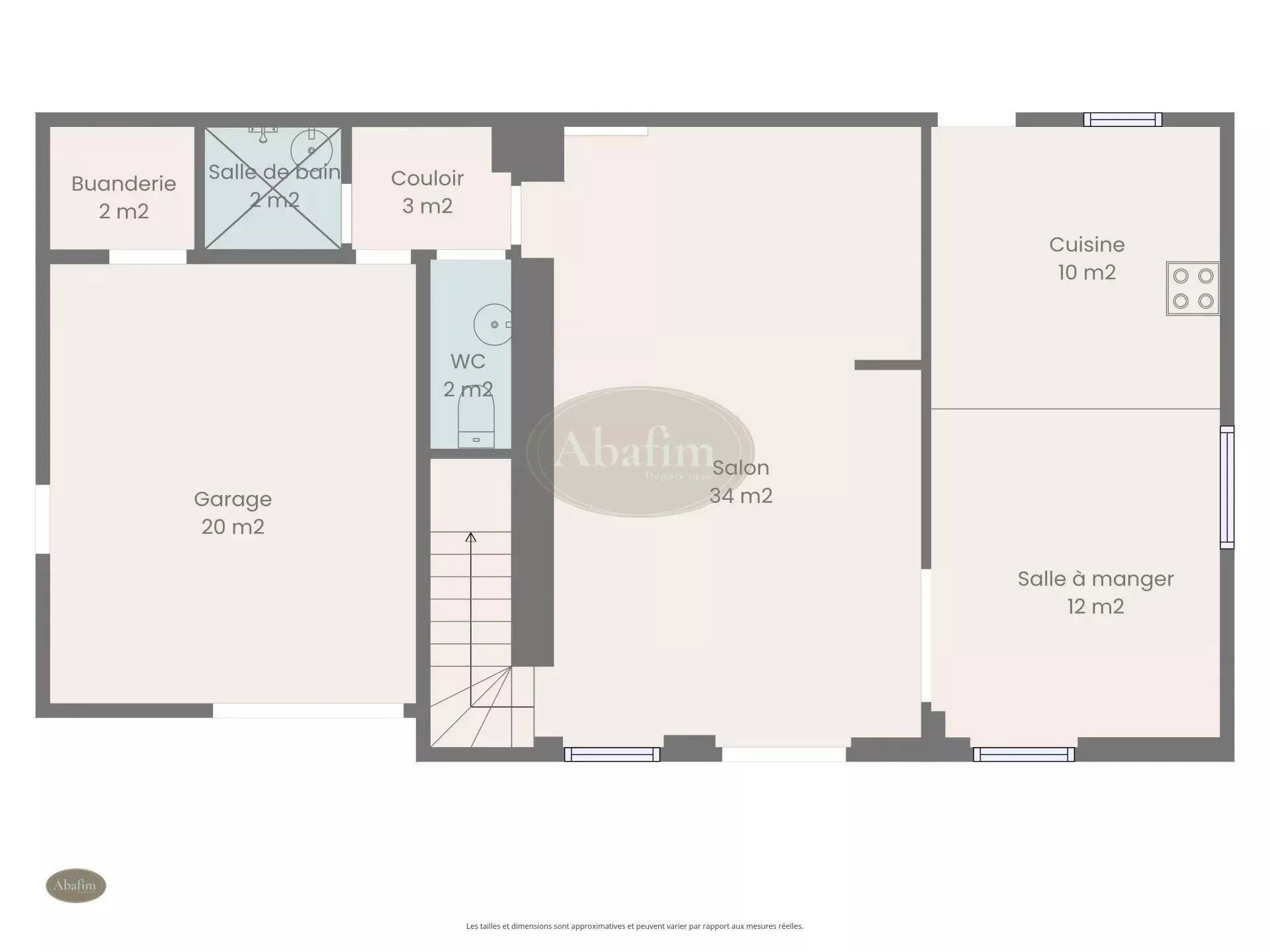 Autour de l’entrée majestueuse s’articulent les quatre pièces du rez-de-chaussée : bureau, cuisine, salle à manger et salon.