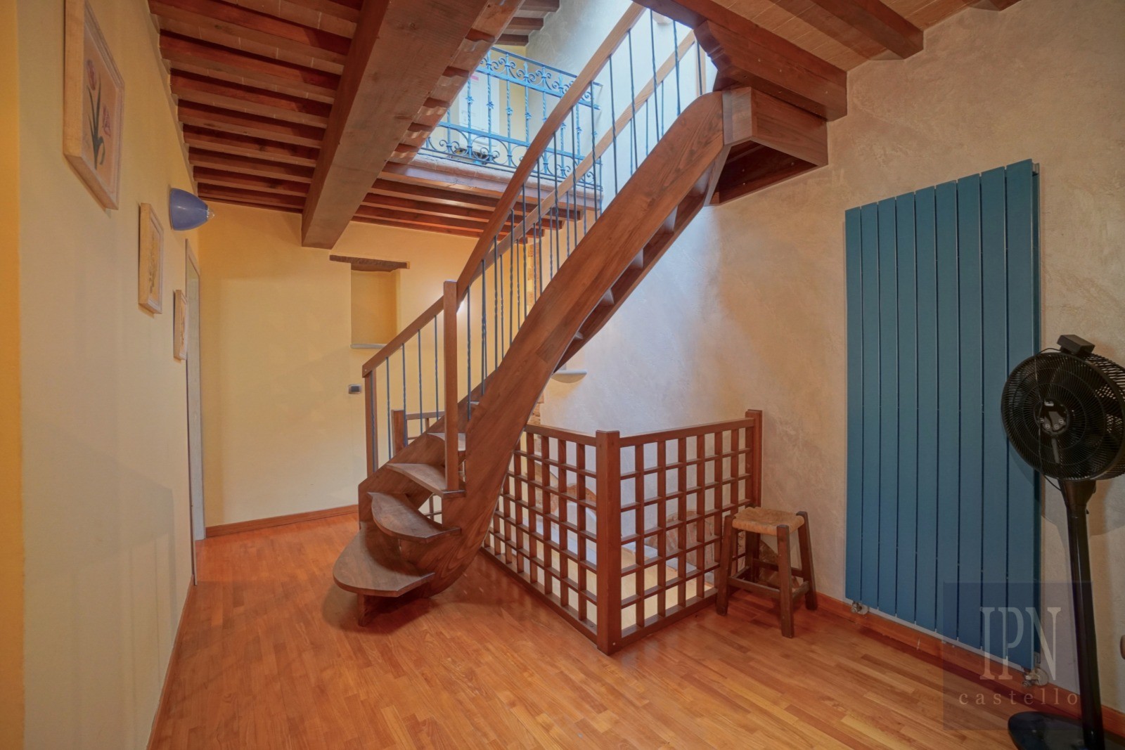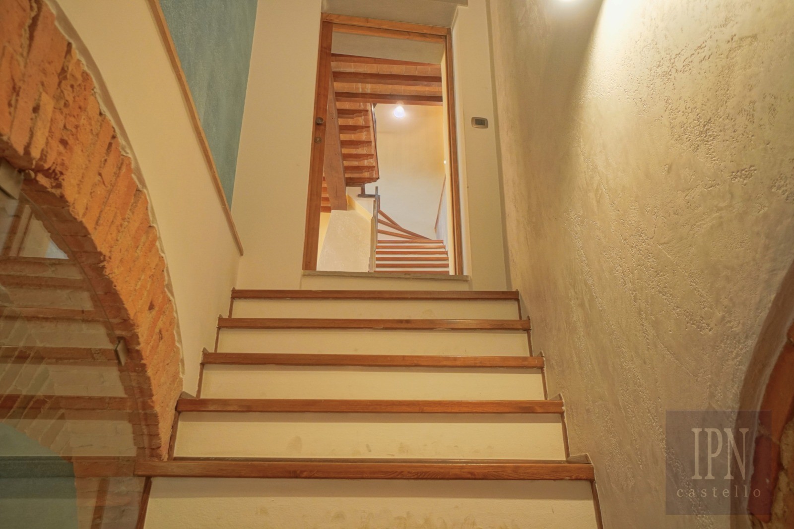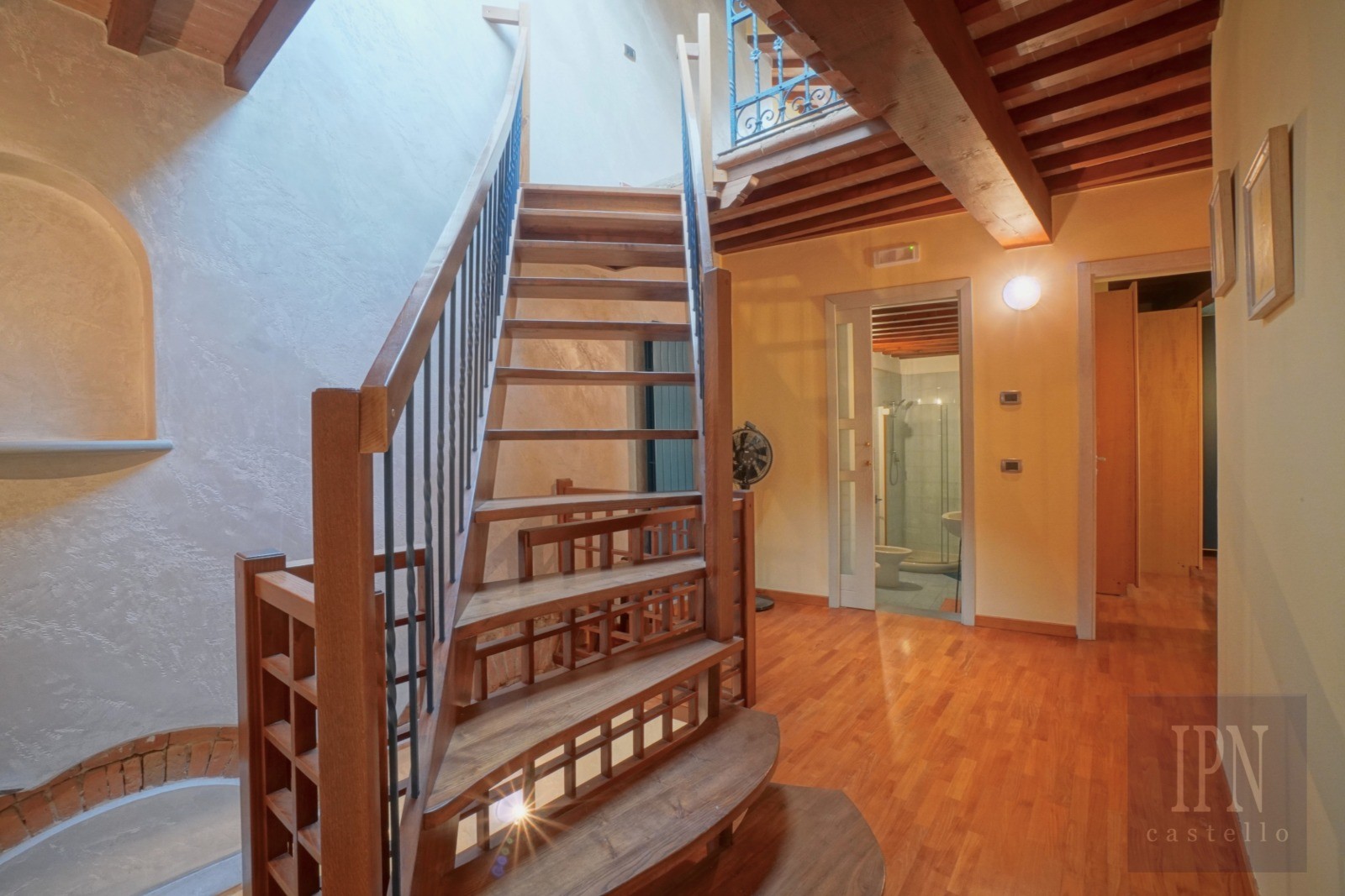 La maison dispose d’une entrée indépendante depuis une ruelle typique. À l’intérieur, un escalier en bois de noyer mène au niveau de vie où se trouve le séjour avec cheminée semi-ouverte. Ce niveau comprend également un WC invité et la cuisine avec accès à un petit balcon offrant une vue sur les toits du centre historique.