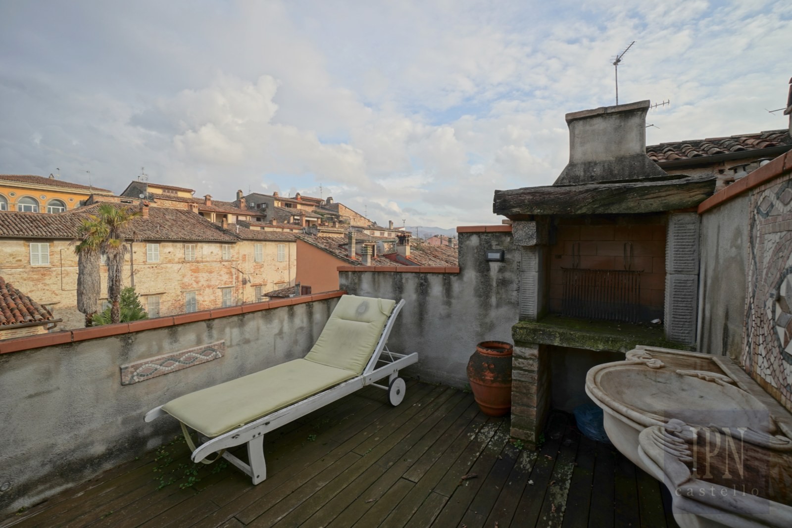 Un escalier aux détails d’origine en fer forgé mène au dernier niveau où se trouvent la buanderie et le local technique ainsi que l’accès à une terrasse privative sur le toit d’environ 10 m². La terrasse est équipée d’un barbecue et d’un évier en marbre et offre des vues sur les rues historiques et le paysage environnant.