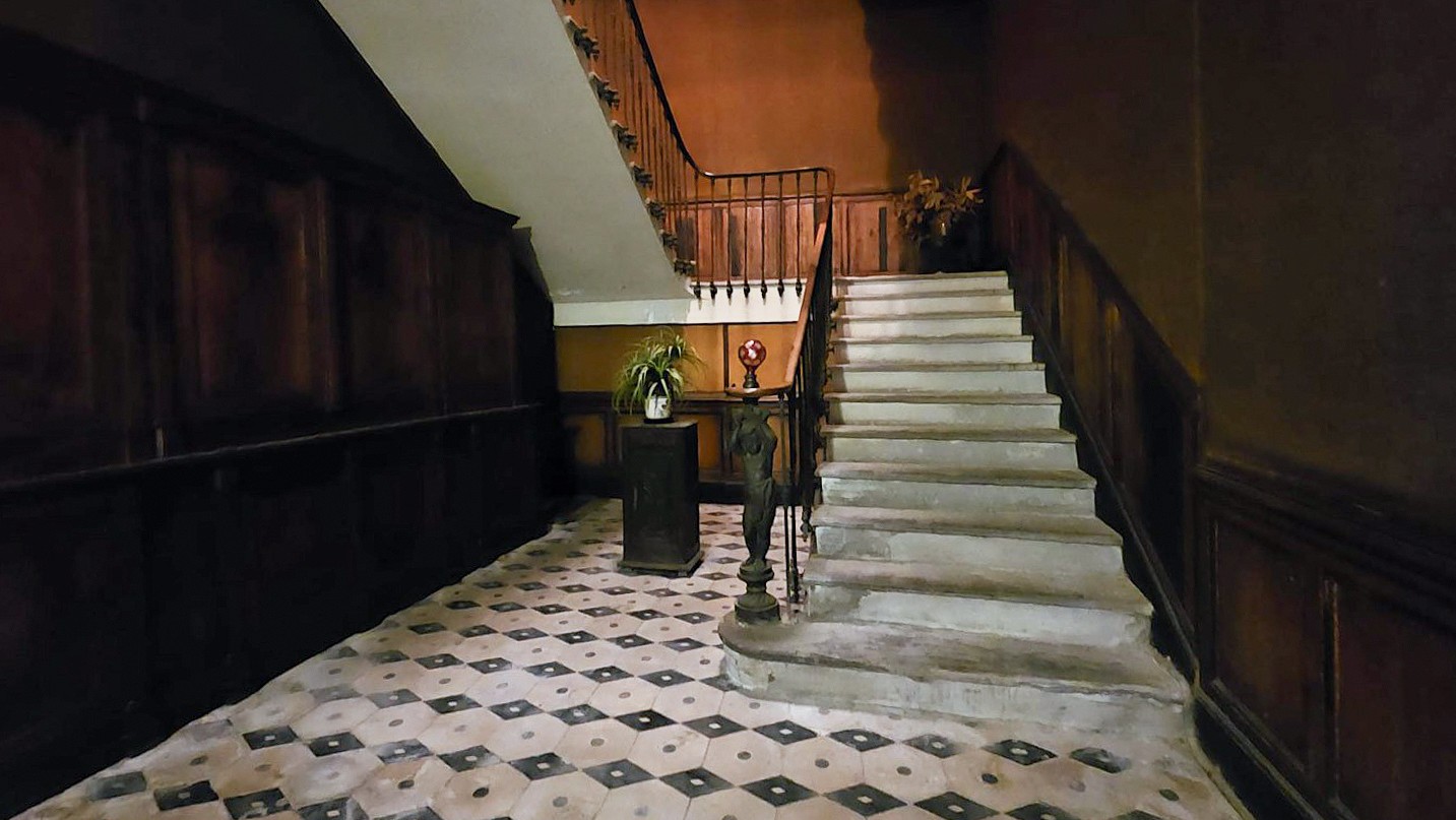 Hall d'entrée Grand escalier Cheminée Terrasse Plafonds hauts Décoration en stuc