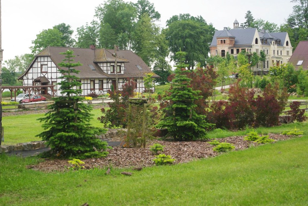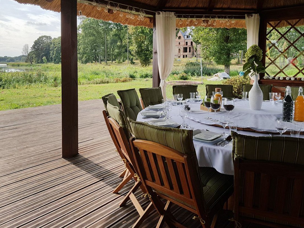 La zone est pavée de pavés en granit, de pierres de champ, de planches de bois, plantée et entretenue. Deux pavillons au bord du lac. Ils sont couverts de roseaux et disposent d'une installation de cuisine et d'un coin détente aménagé. Le charme des pavillons est souligné par leur emplacement sur une péninsule.