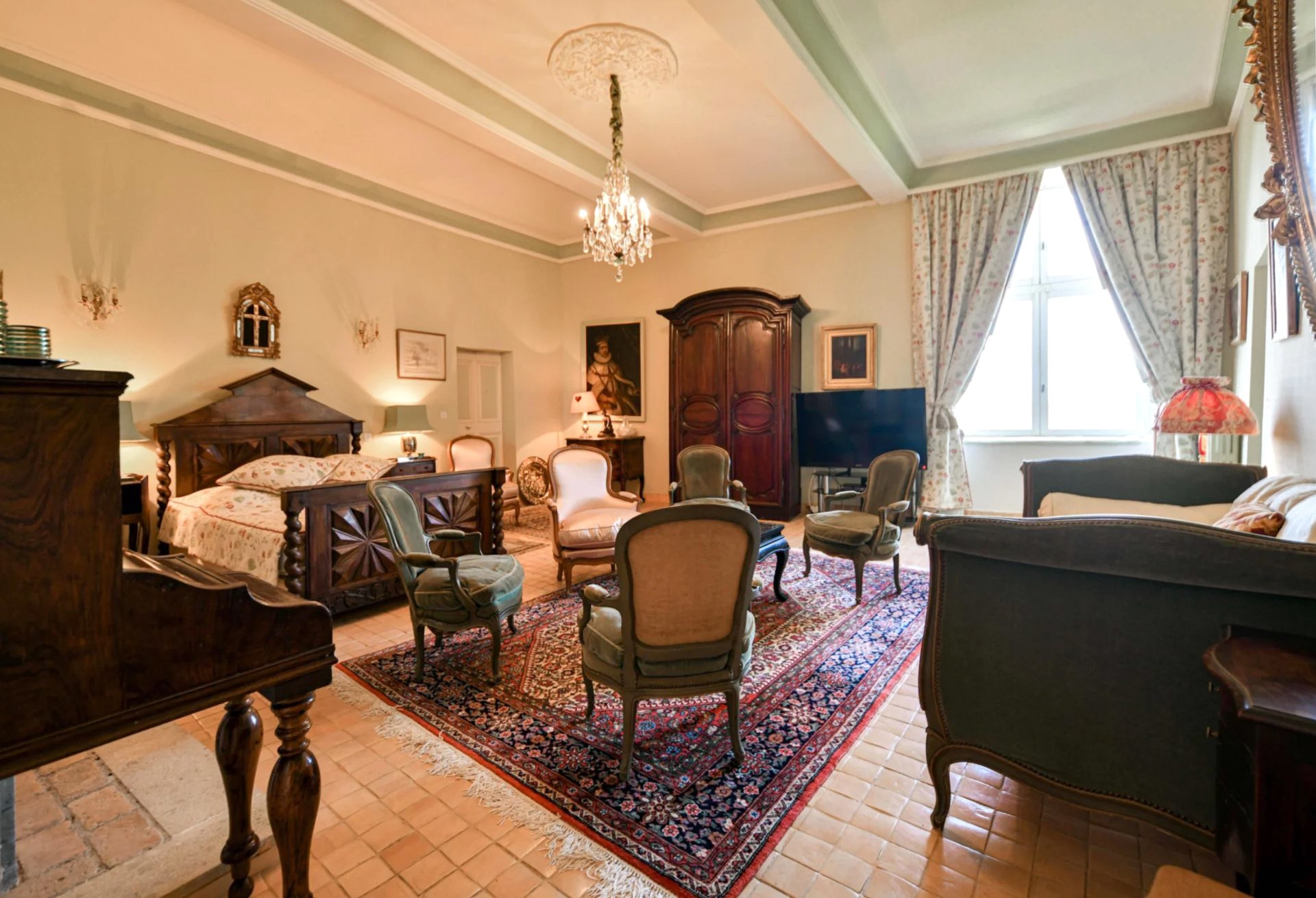 Deux entrées vous accueillent dans un vaste et somptueux salon voûté qui offre un plafond du XVIIᵉ siècle. Un bel escalier d’honneur mène à l’étage où se trouvent deux salons, une élégante salle à manger avec cheminée et une bibliothèque. Un vaste couloir dessert un bureau, la cuisine ainsi qu’une superbe suite principale de 100 m².