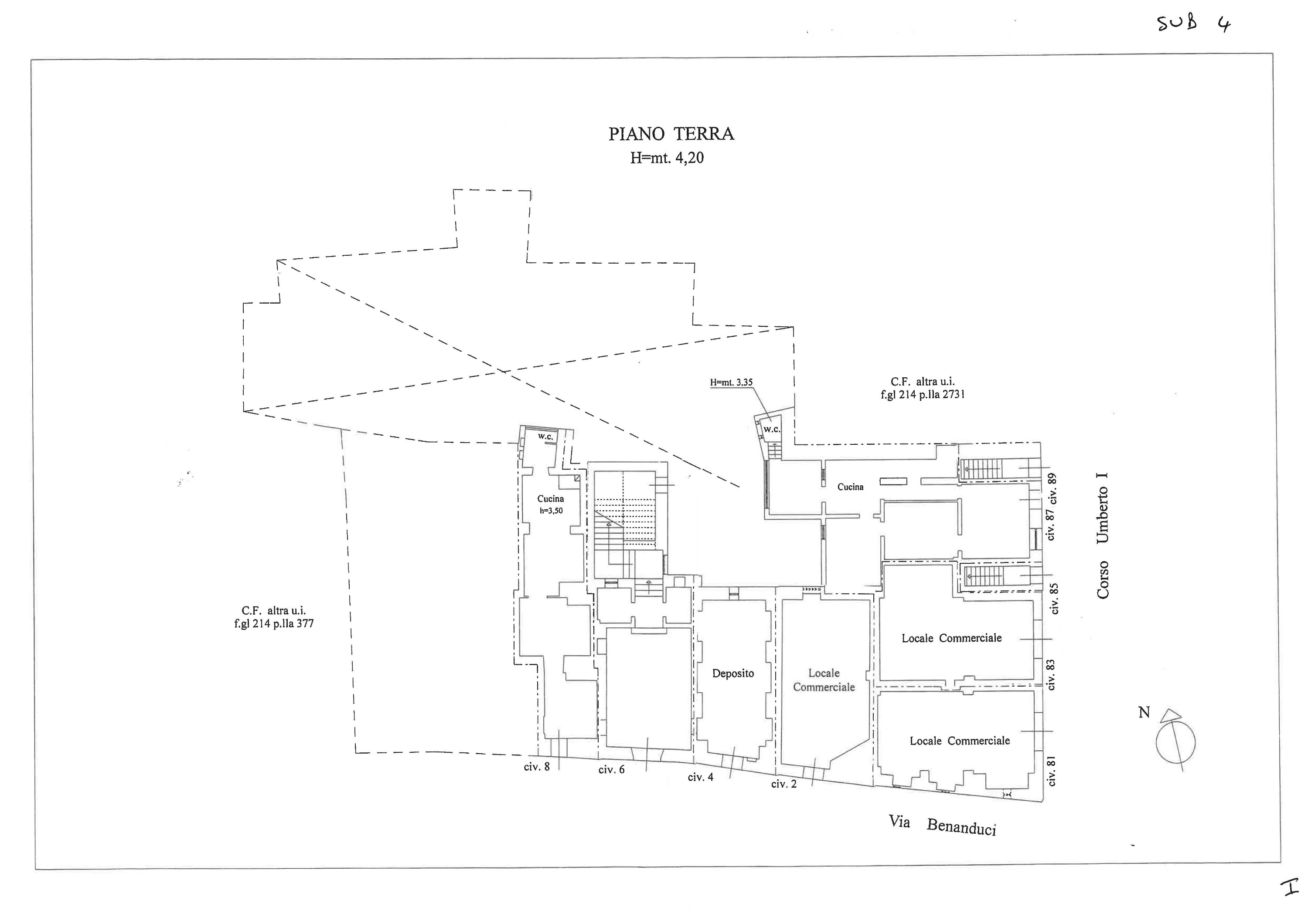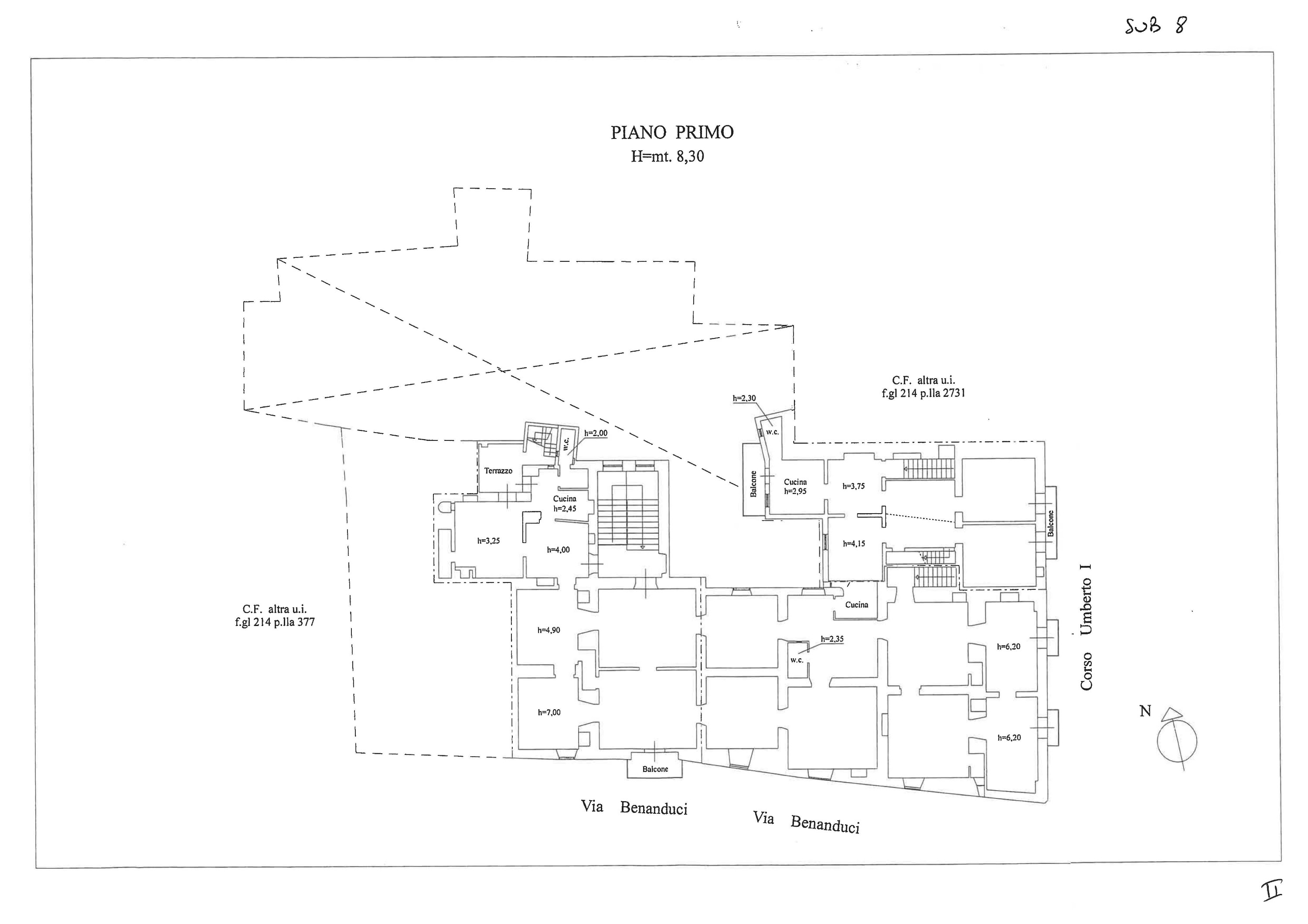The first floor measures approximately 705 sq m, with access and frontage both to Via Benanduci and to Corso Umberto I, where additional rooms belonging to the property were also used in more recent times. The ground floor totals approximately 714 sq m, with parts now featuring commercial use.