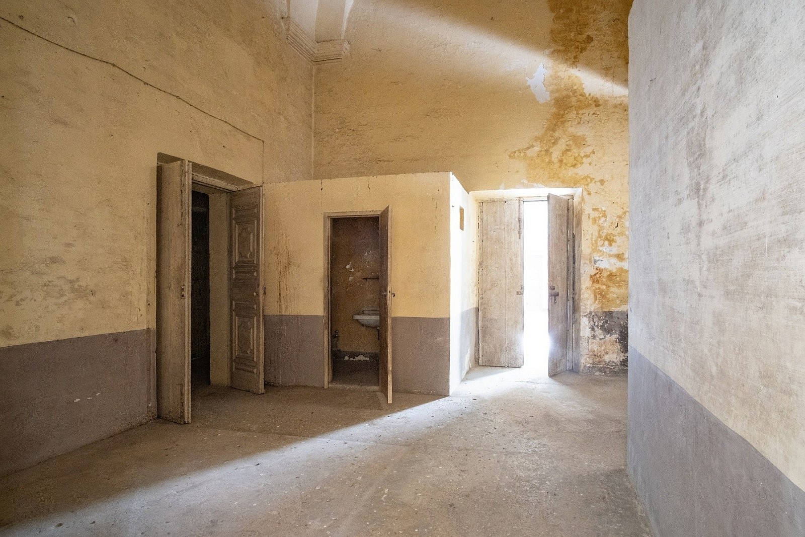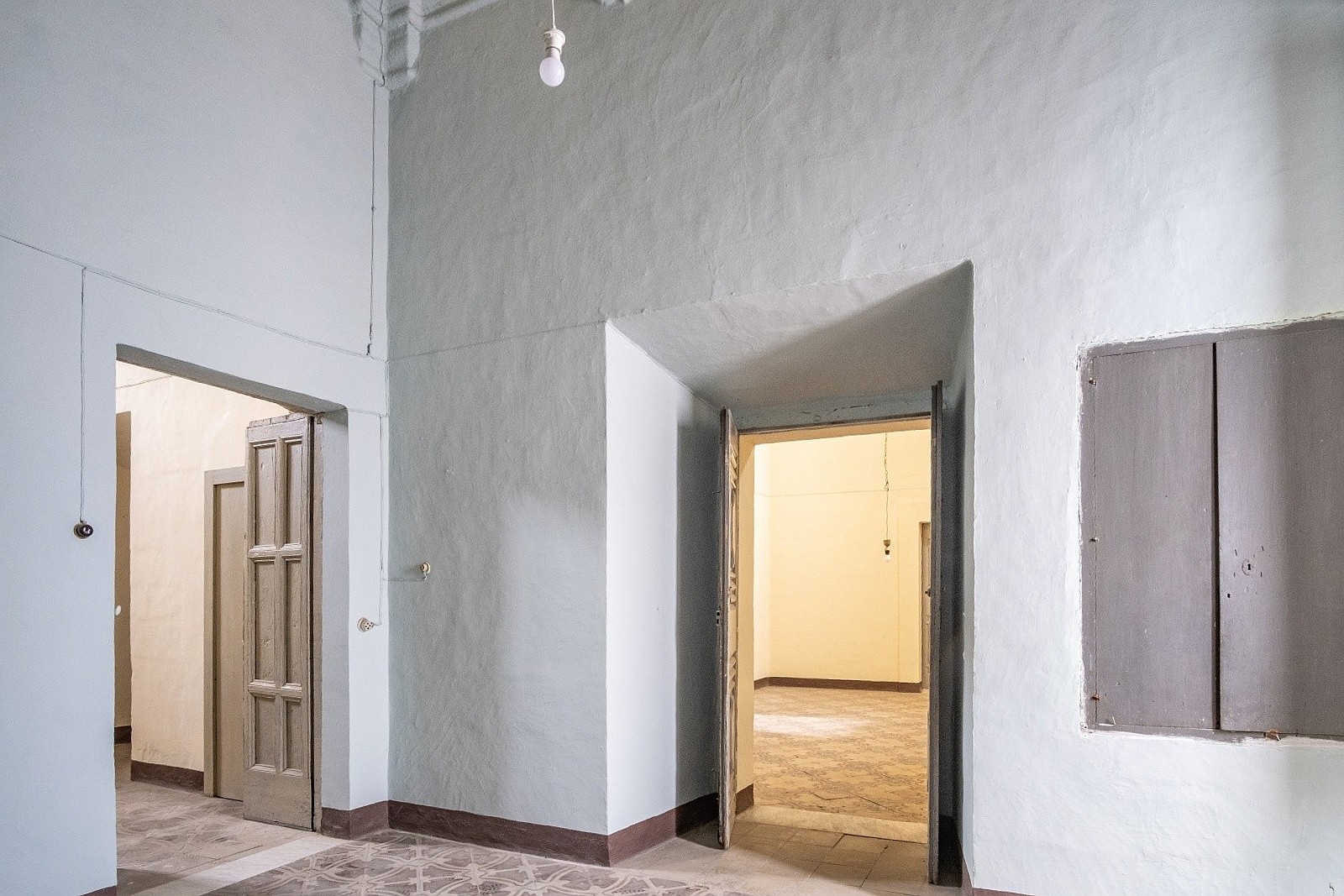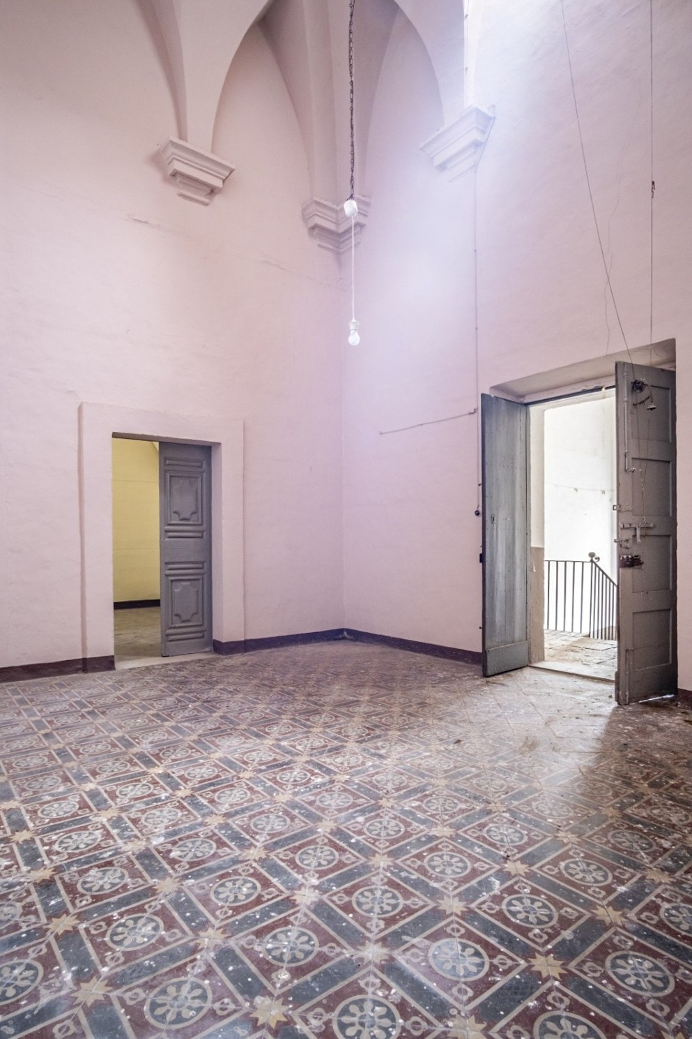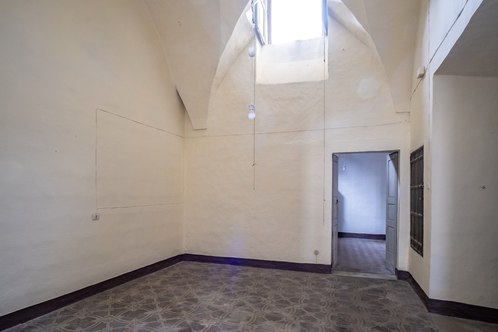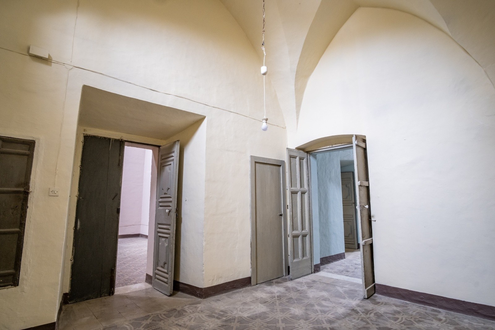 The palace rises over two above-ground levels. Historically, the ground floor served as storage and goods handling, while the piano nobile (first floor) was the formal residential level. The main entrance from Via Benanduci features a distinctive stone portal, topped by a balcony, leading into a grand entrance hall with a star-vaulted ceiling and traditional chianche stone flooring. A striking stone staircase then leads to the piano nobile, where you’ll find the classic layout of noble residences: generous vaulted rooms with impressive ceiling heights, divided by original 17th-century wooden doors.