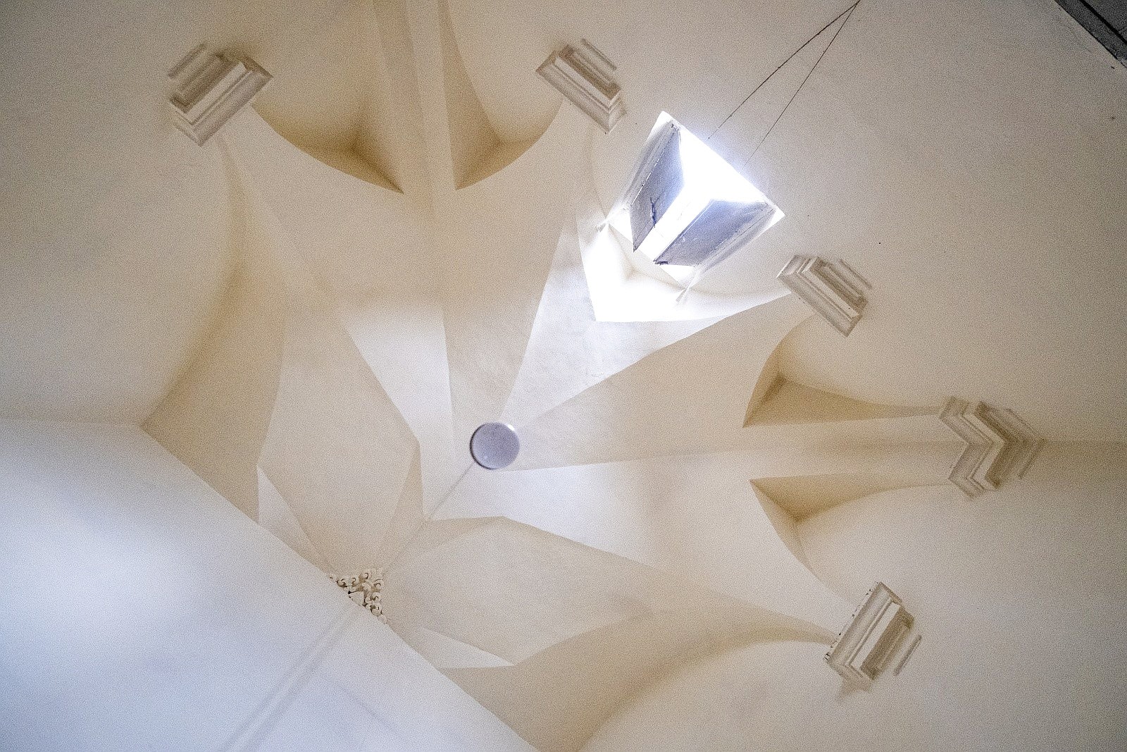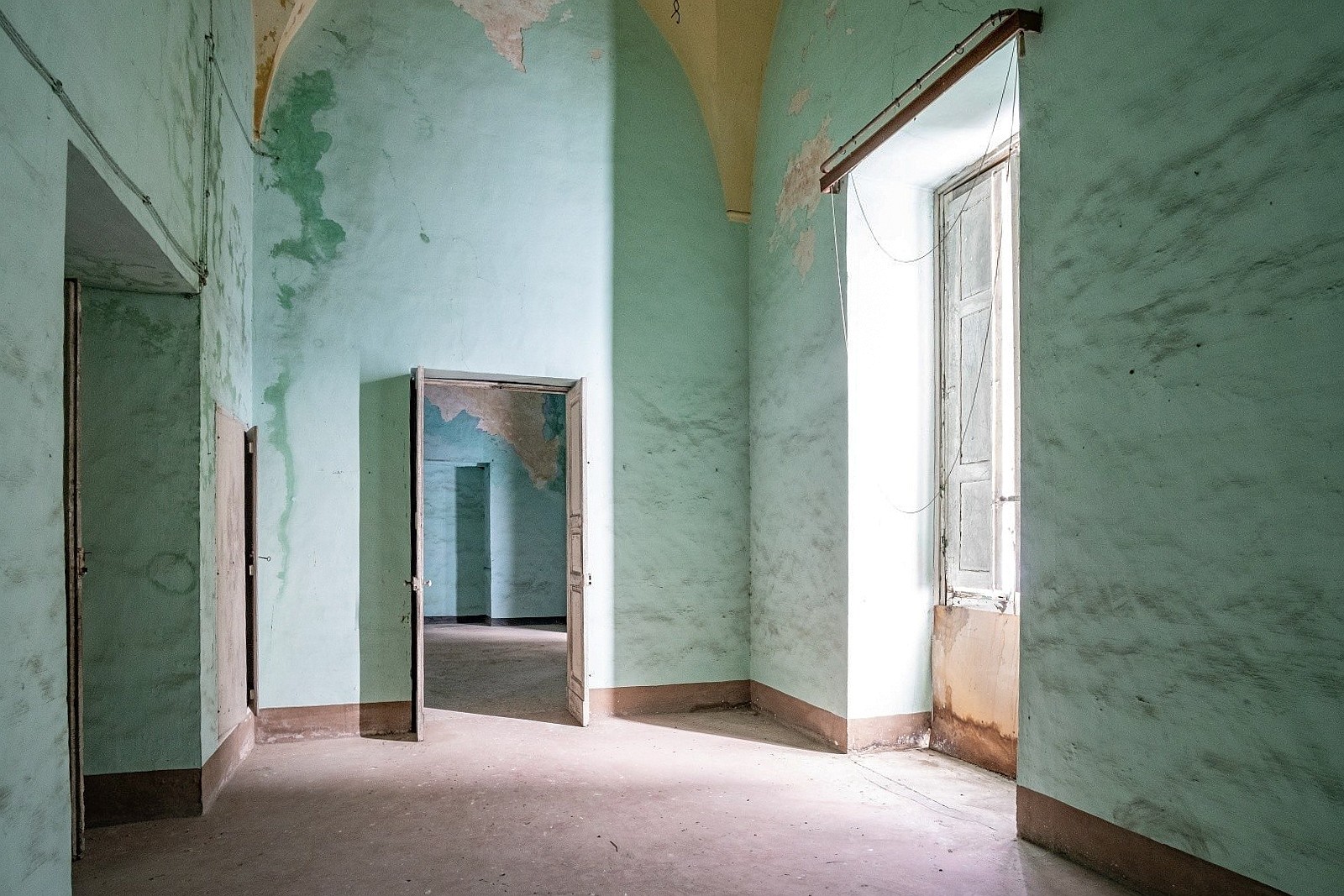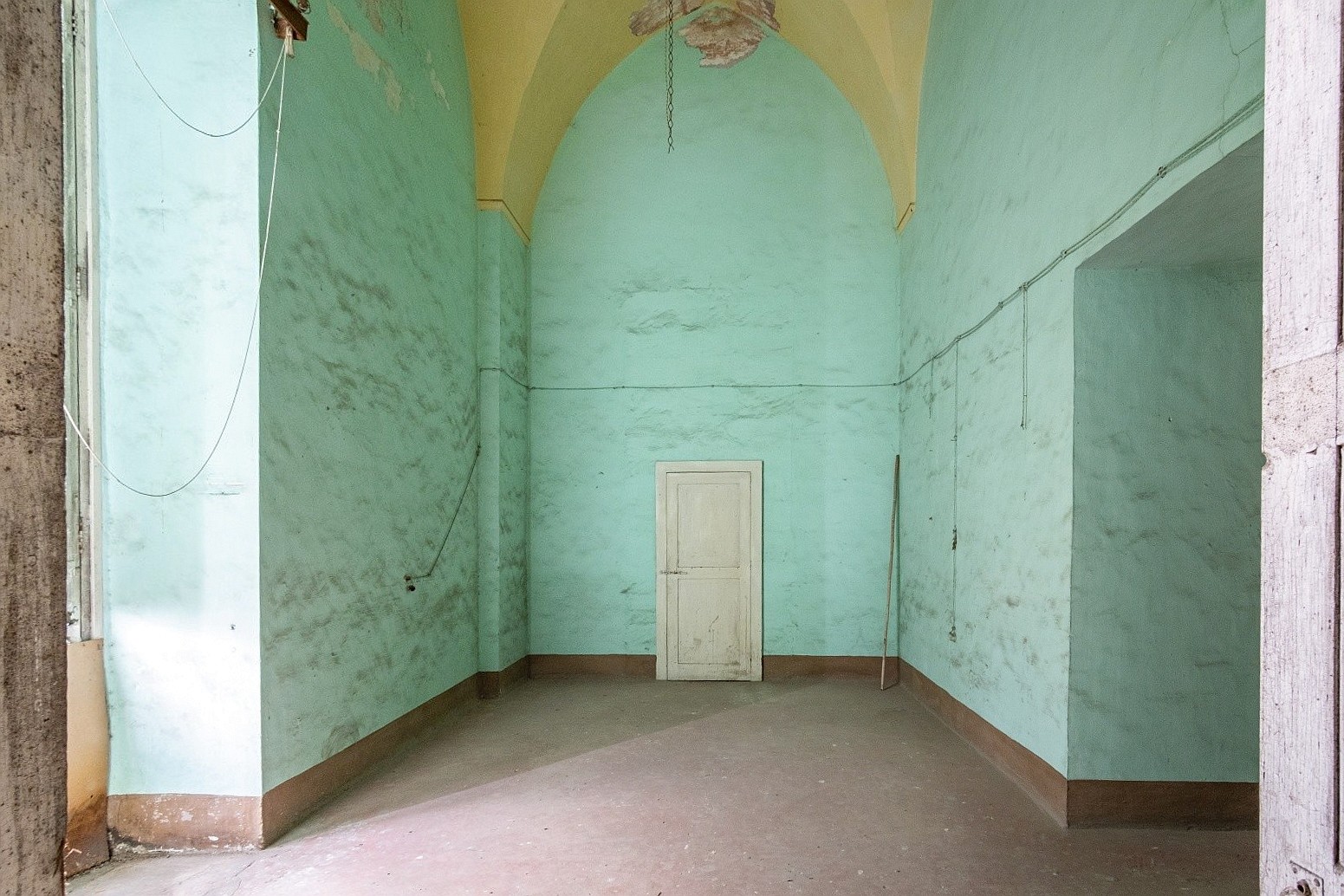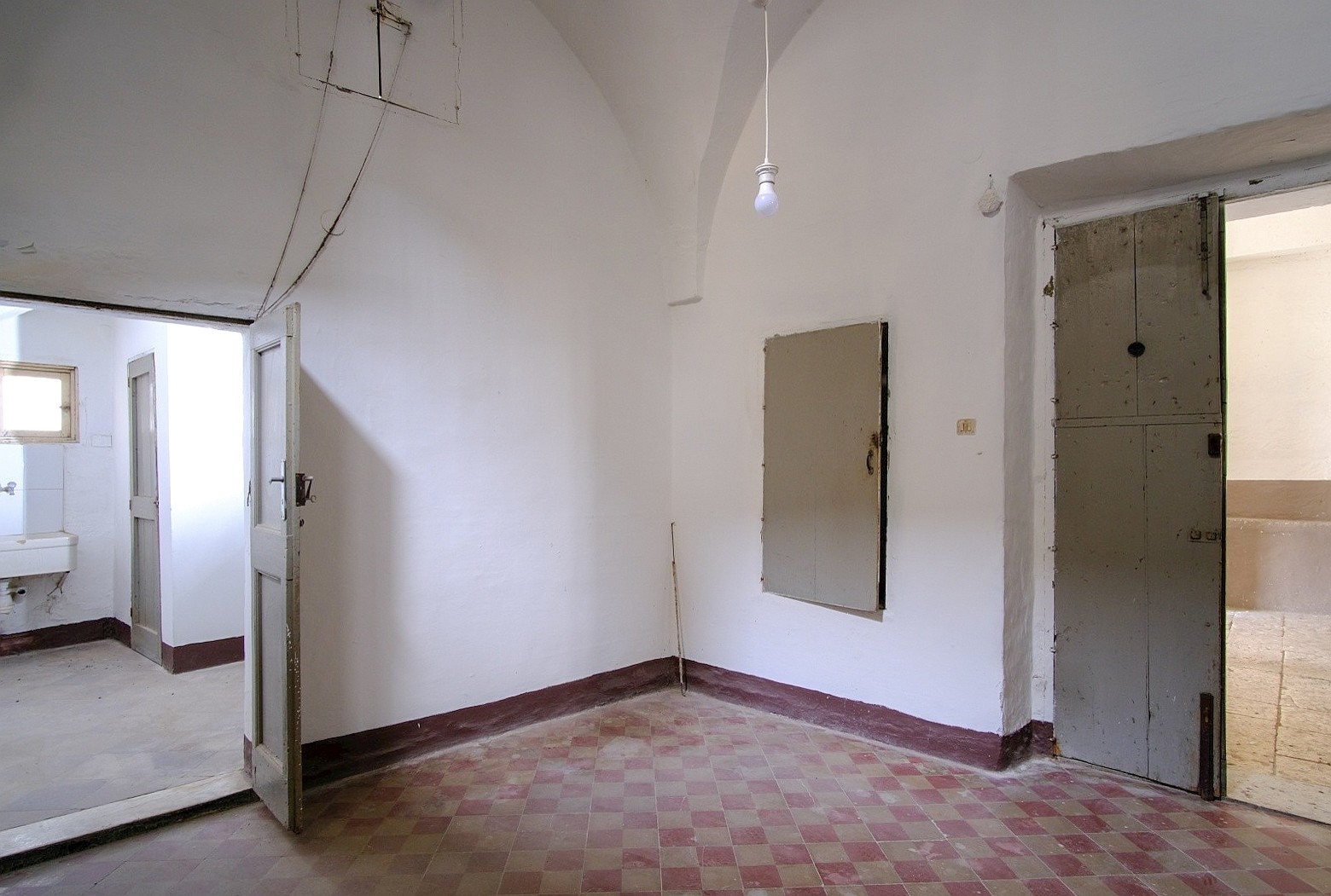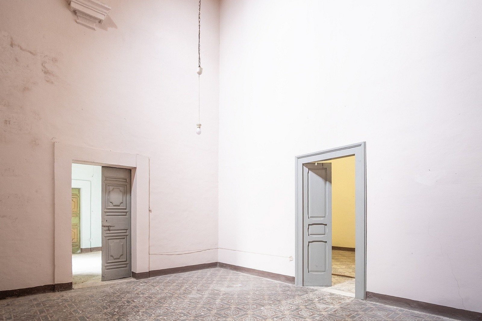 The palace rises over two above-ground levels. Historically, the ground floor served as storage and goods handling, while the piano nobile (first floor) was the formal residential level. The main entrance from Via Benanduci features a distinctive stone portal, topped by a balcony, leading into a grand entrance hall with a star-vaulted ceiling and traditional chianche stone flooring. A striking stone staircase then leads to the piano nobile, where you’ll find the classic layout of noble residences: generous vaulted rooms with impressive ceiling heights, divided by original 17th-century wooden doors.