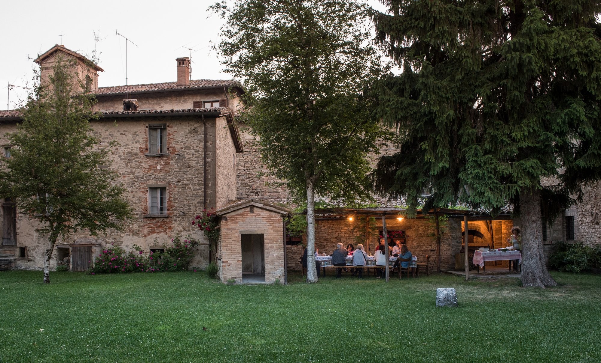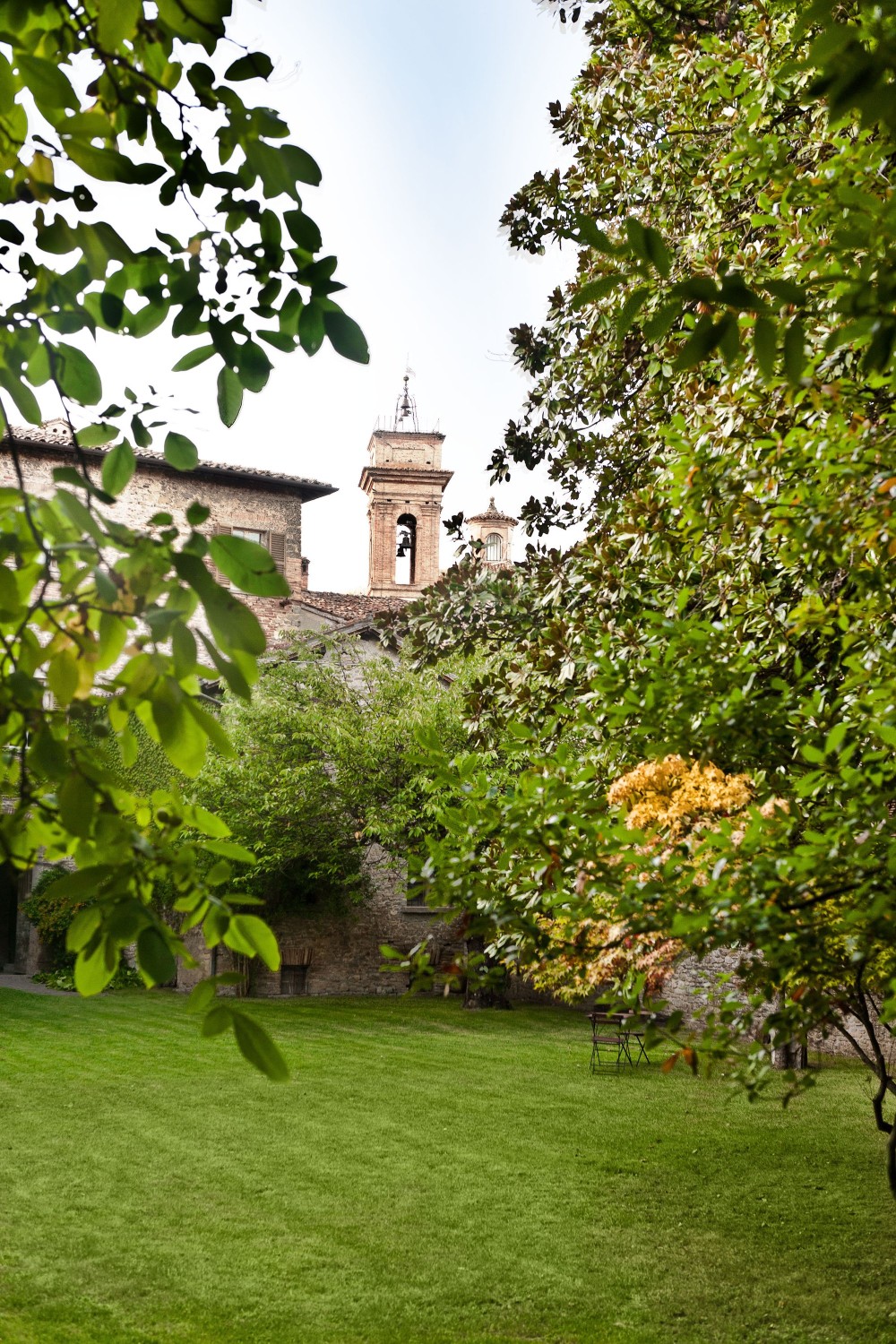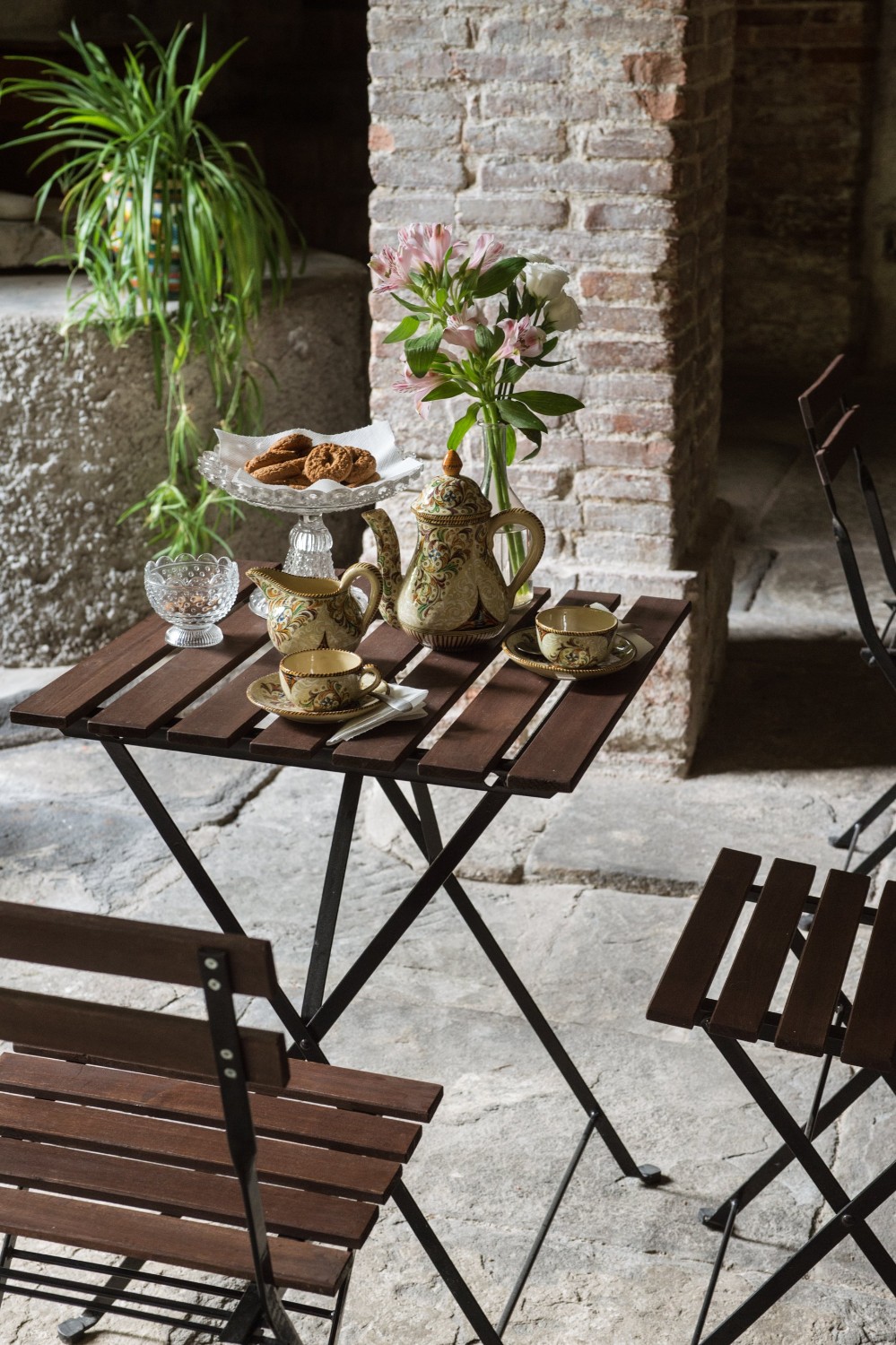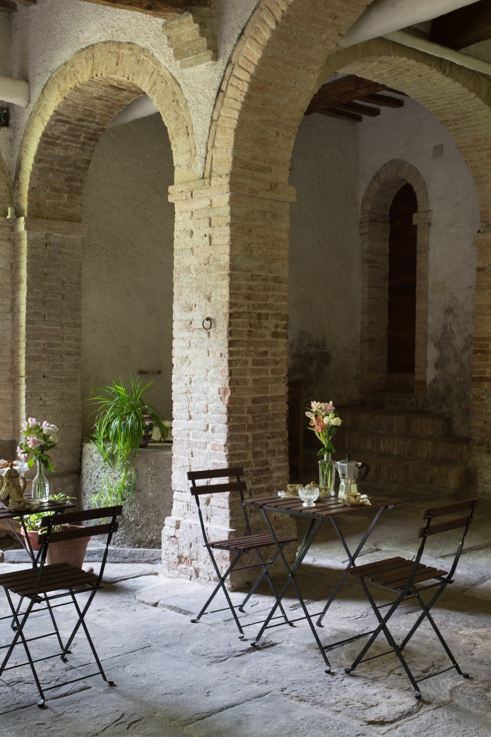 Le jardin central constitue un véritable havre de paix avec ses roses, ses agrumes, sa pergola et sa fontaine ancienne. De petits balcons et de larges fenêtres panoramiques offrent une vue sur le village et les collines environnantes des Apennins, reliant harmonieusement l’intérieur et l’extérieur.