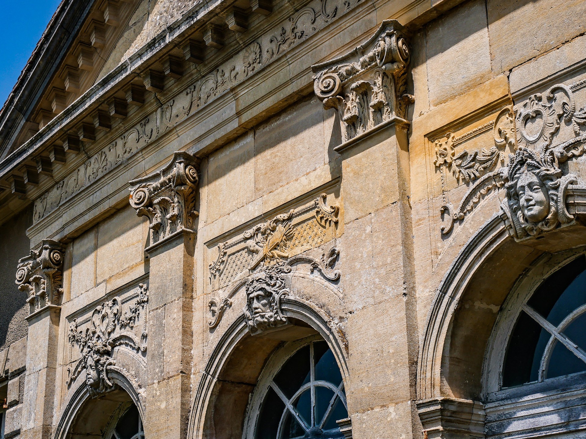La façade symétrique se distingue par un portique néoclassique à quatre pilastres surmonté d’un fronton richement sculpté. Les fenêtres en plein cintre exhibent des mascarons uniques, inspirés du Château de Versailles, notamment un mascaron central représentant Hercule, symbole emprunté au salon d’Hercule conçu par Robert de Cotte.