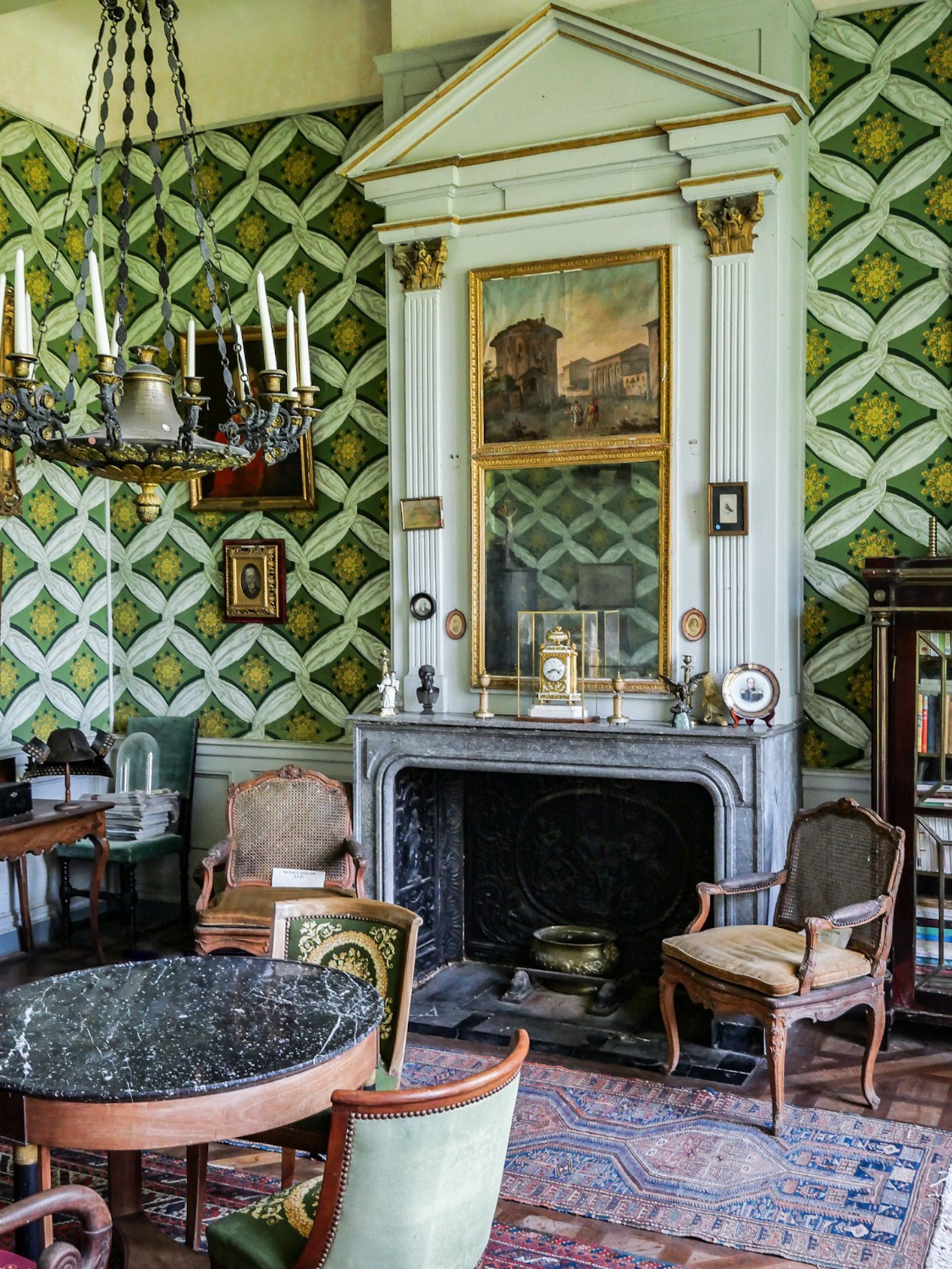 Le rez-de-chaussée, aux plafonds de 4,5 mètres, comprend un hall d’entrée, un grand escalier à balustre, une bibliothèque en boiseries Directoire, plusieurs salons richement décorés avec cheminées en marbre, une grande cuisine en pierre, ainsi qu’une salle à manger ornée de poêles en faïence du XVIIIe siècle.