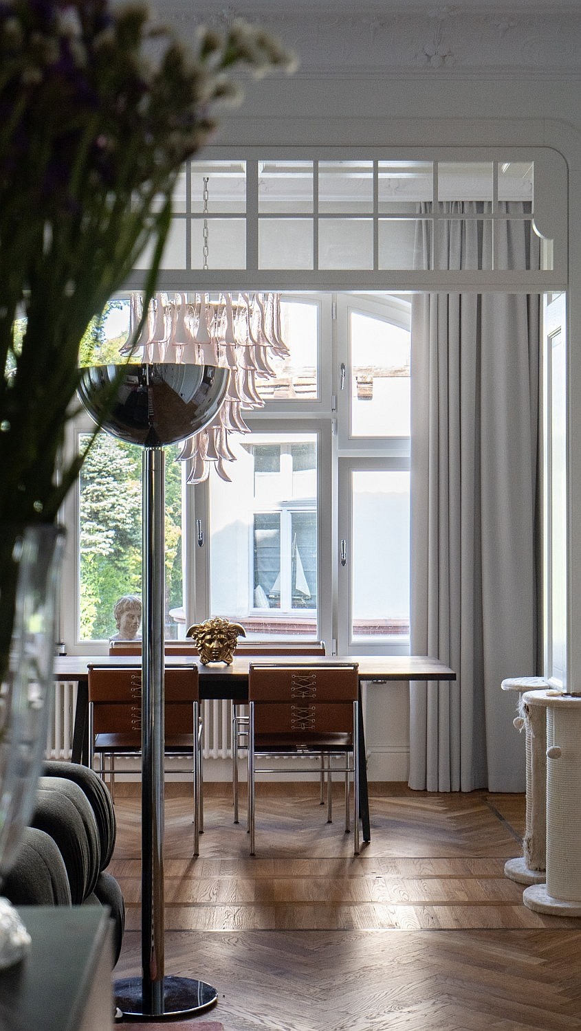 Originaler Eichenparkett im französischen Fischgrätmuster, Stuckverzierungen an Wänden und Decken, maßgefertigte Möbel. Deckenhöhe über drei Meter. Große Fenster sorgen für gute Tageslichtversorgung.