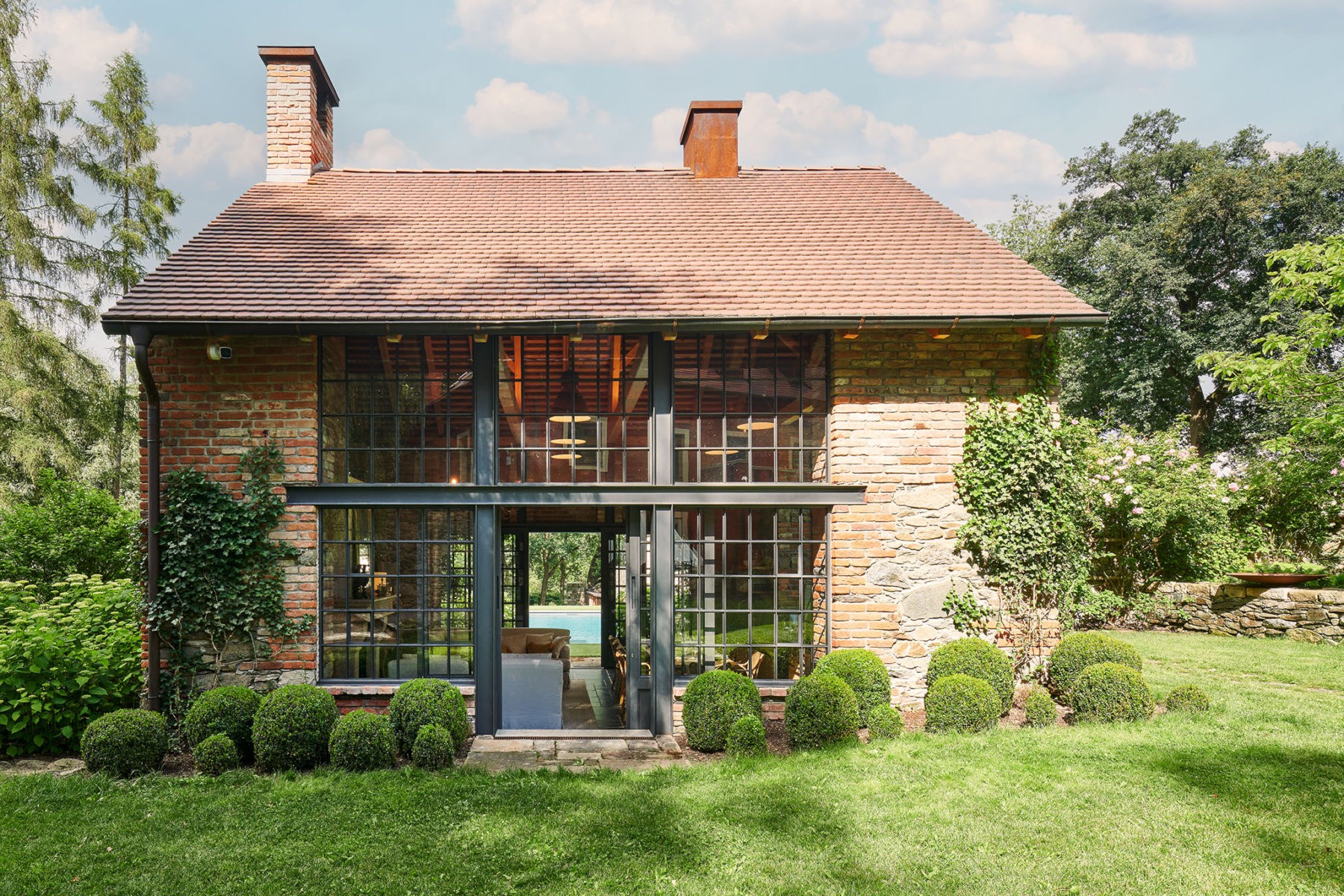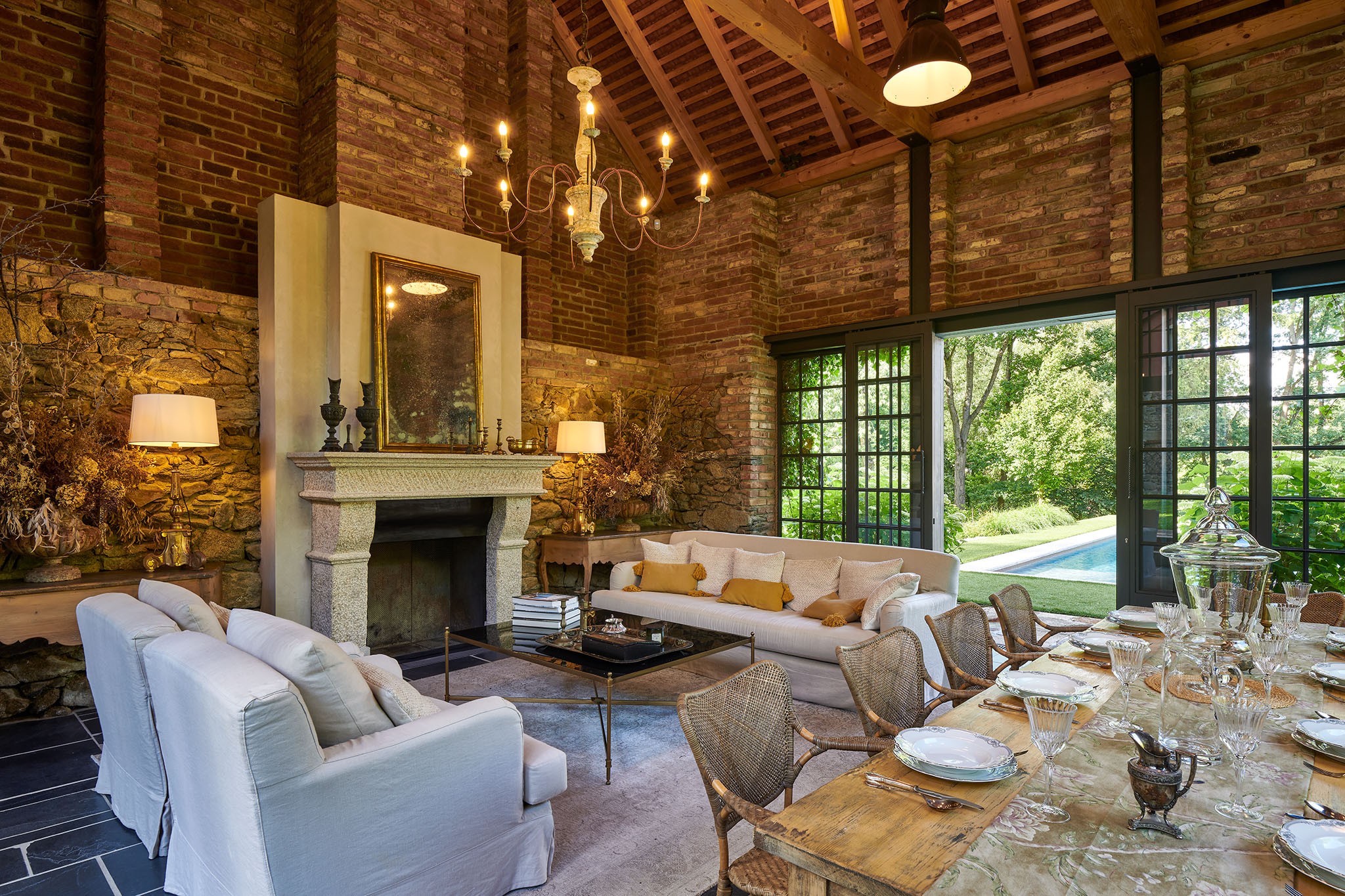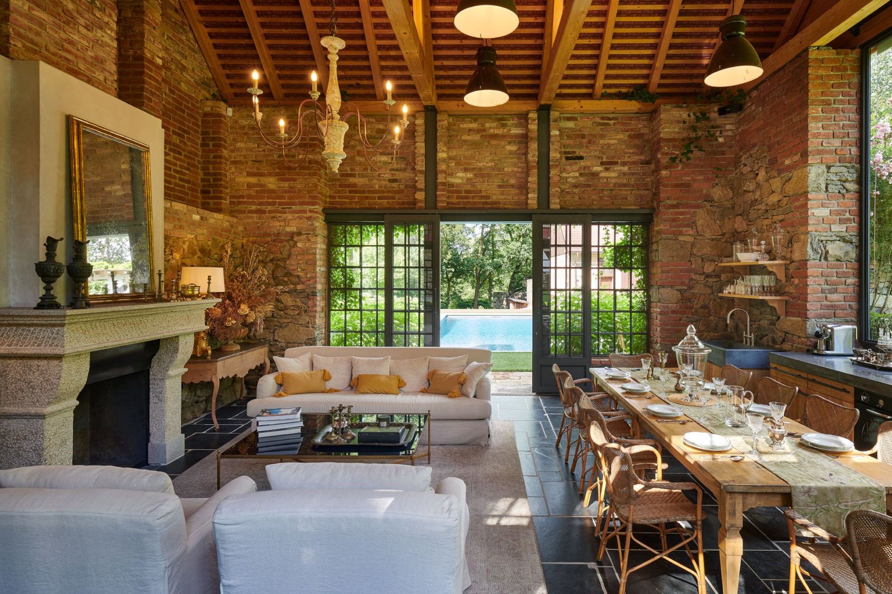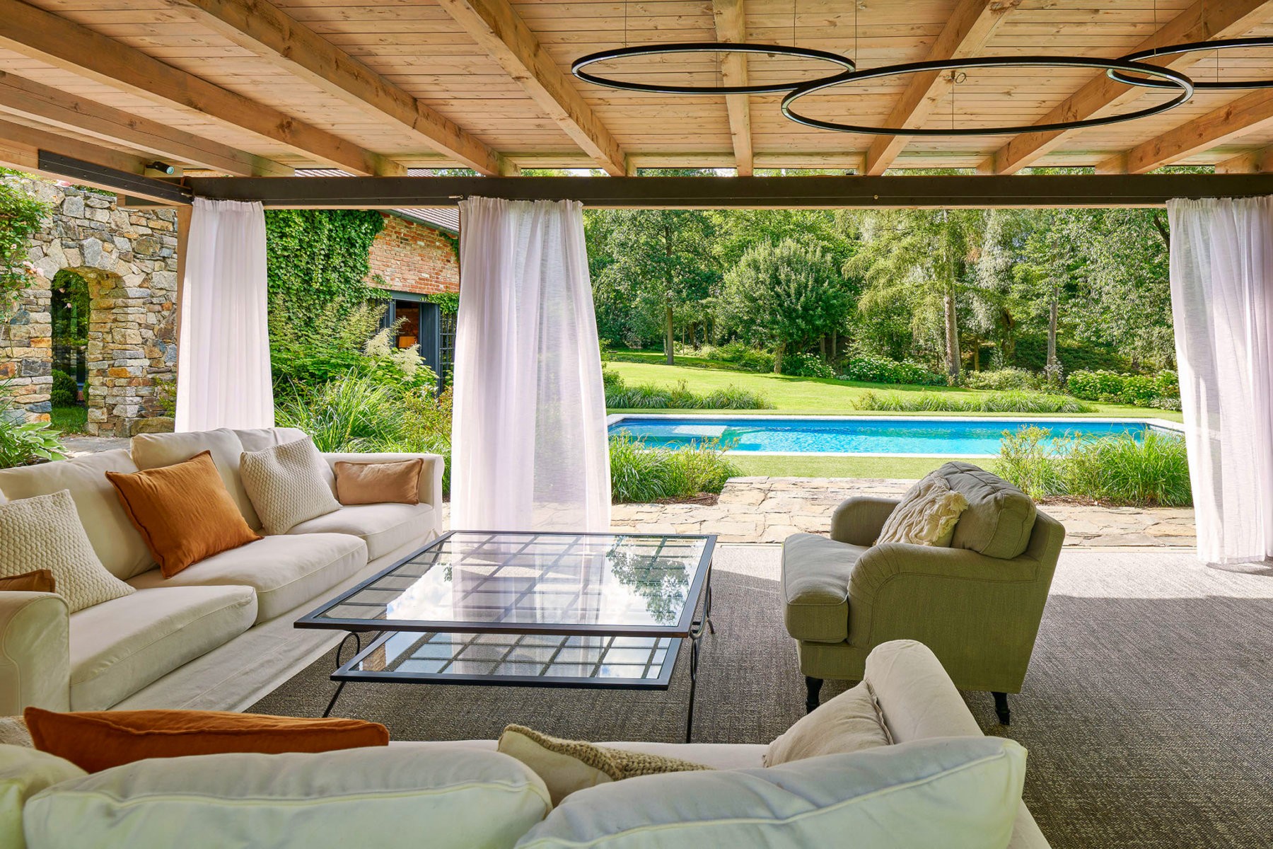 Le cœur de l’espace extérieur est la zone de la piscine. À côté se trouve une maisonnette avec cheminée, reliée par une terrasse au bassin. De l’autre côté, une terrasse couverte offre un espace de repos supplémentaire. Plus en retrait, une grange rénovée abrite aujourd’hui un vaste garage, un atelier, une salle de loisirs et une buanderie.
