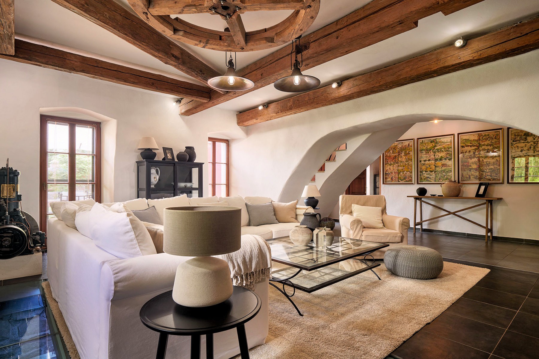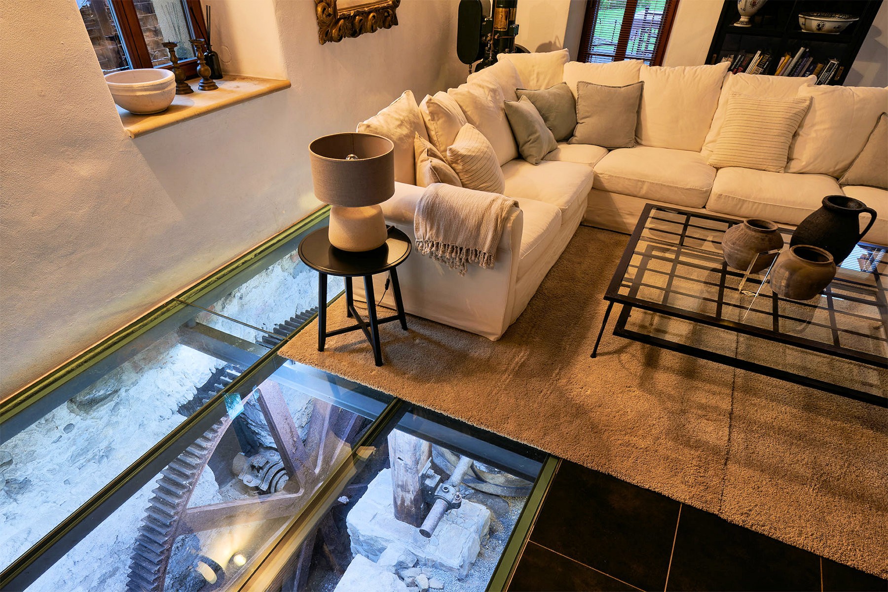 La maison principale comprend quatre chambres, chacune avec sa salle de bain. Le rez-de-chaussée s’organise autour d’un grand séjour donnant sur la roue du moulin préservée, ainsi qu’une cuisine et des pièces de service. Une cave occupe le sous-sol.