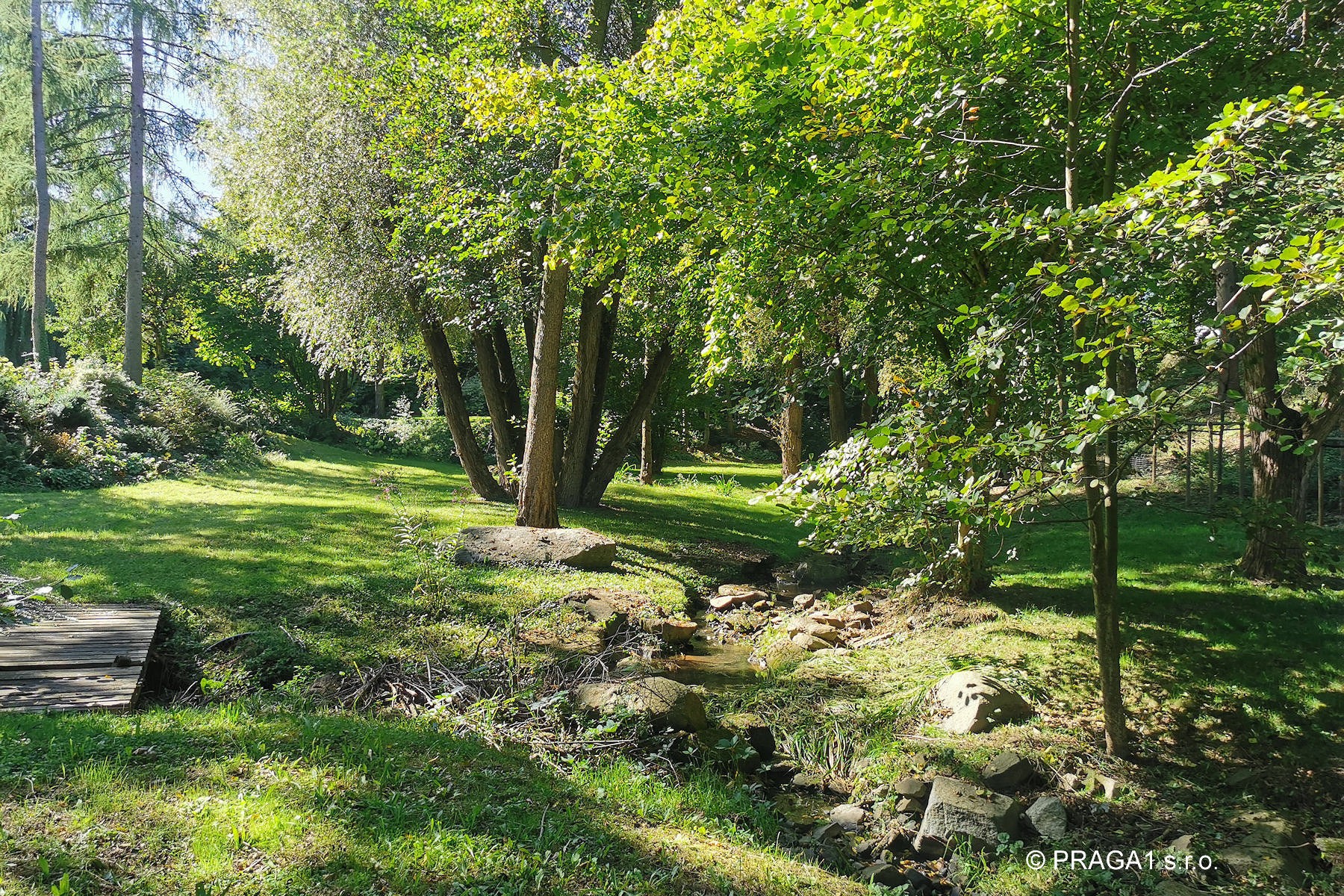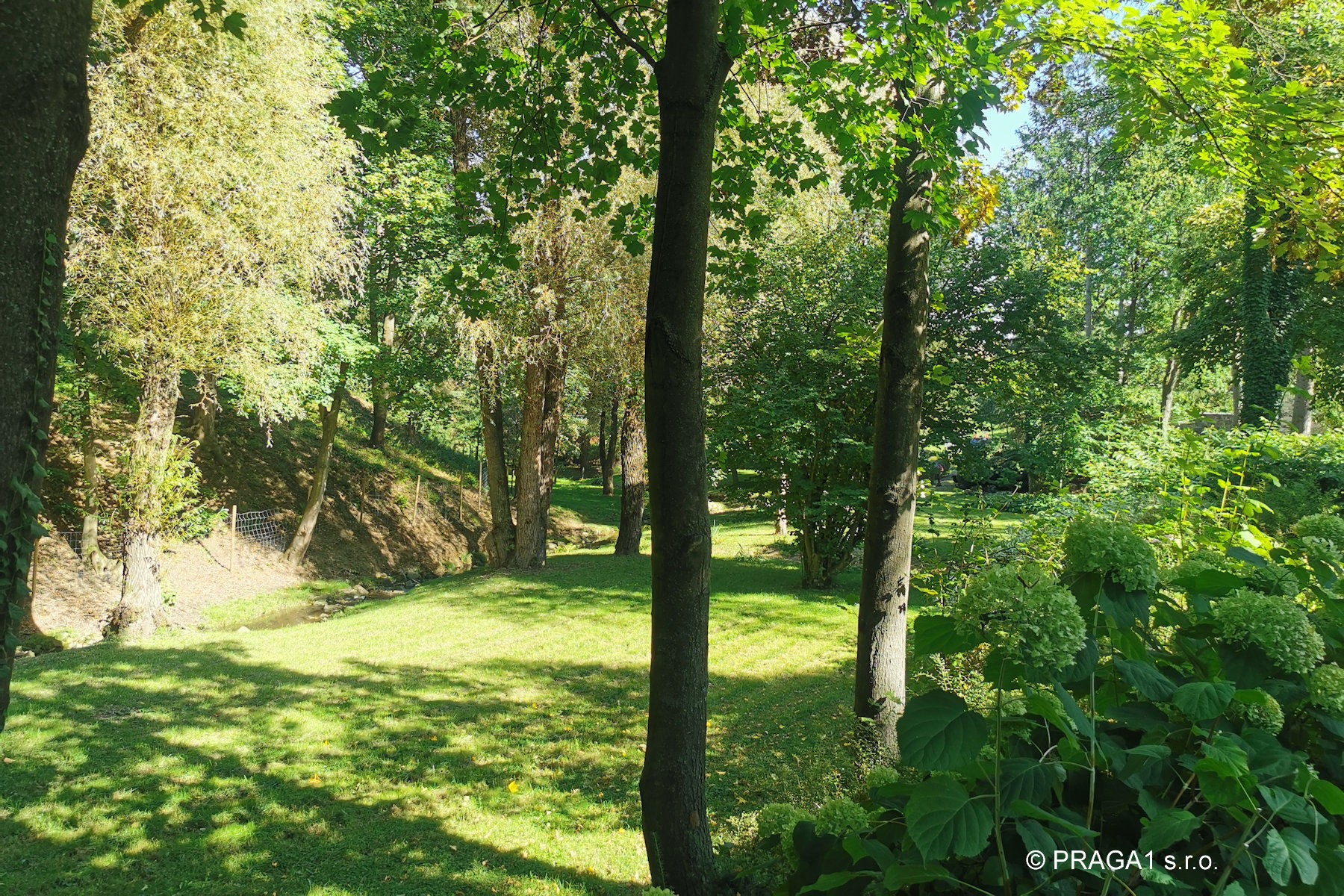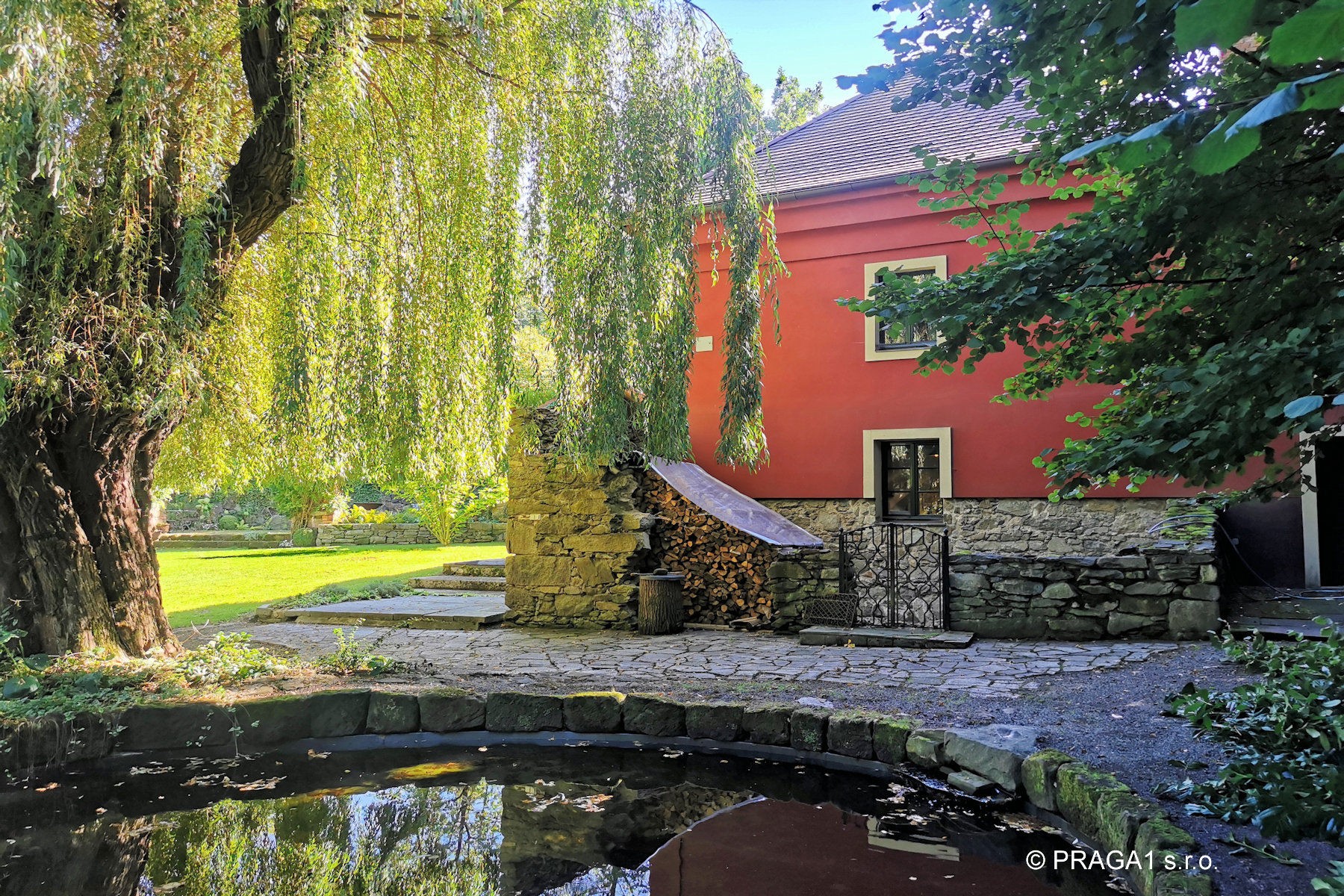 Ce moulin du XVIIIe siècle a été entièrement restauré et s’étend sur un terrain de 1,2 hectare, à seulement vingt minutes en voiture de Prague. Le bâtiment principal, construit à l’origine en pierre et en brique, est complété par plusieurs dépendances réalisées dans le même esprit architectural. L’ensemble est ceint d’un mur de pierre et entouré de vieux arbres, de massifs fleuris et de buissons décoratifs. Un ruisseau traverse le parc, accentuant le caractère unique du lieu.