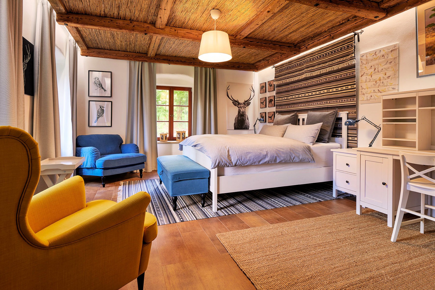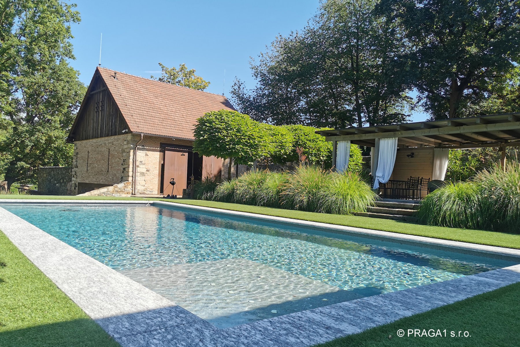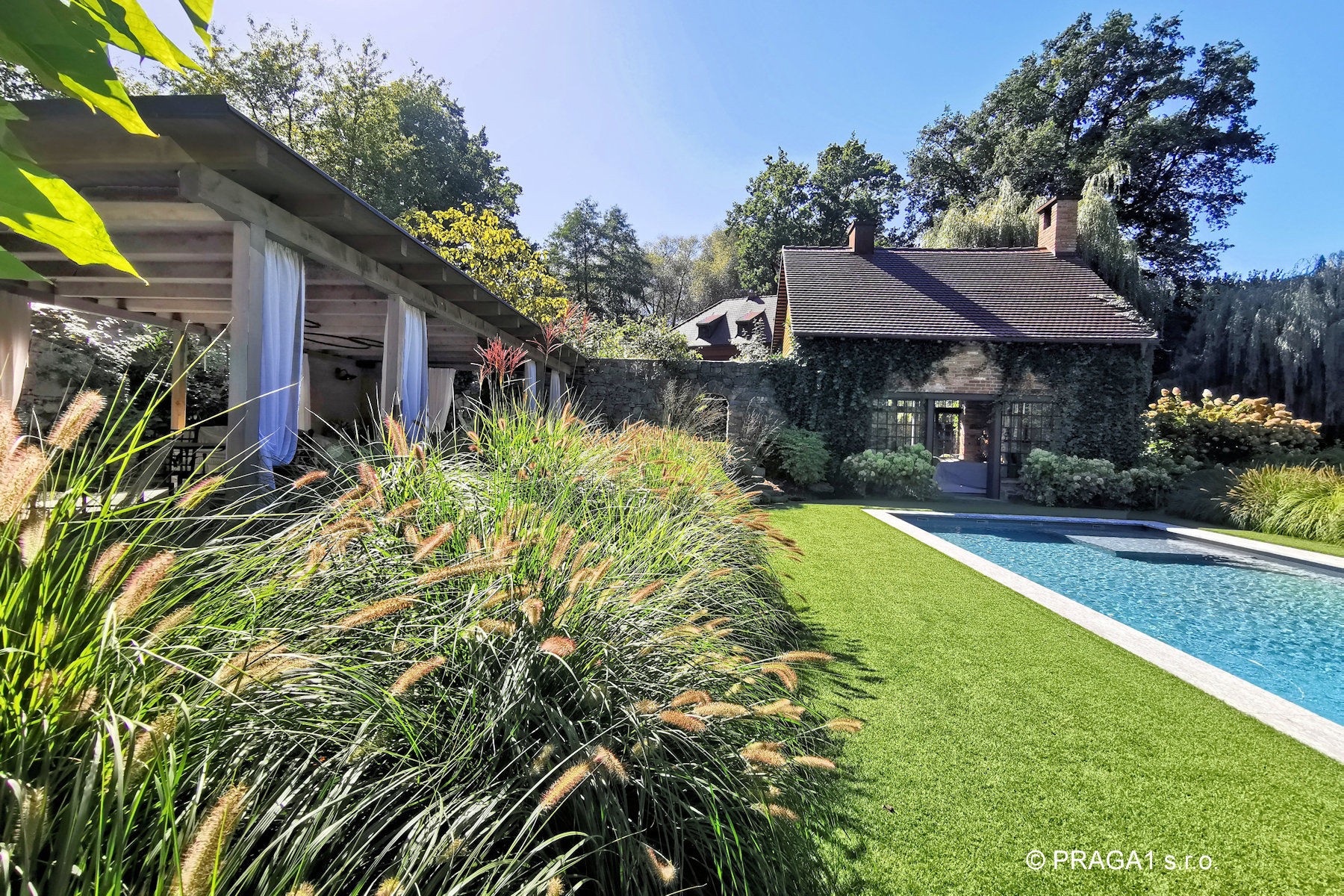 Ce moulin du XVIIIe siècle a été entièrement restauré et s’étend sur un terrain de 1,2 hectare, à seulement vingt minutes en voiture de Prague. Le bâtiment principal, construit à l’origine en pierre et en brique, est complété par plusieurs dépendances réalisées dans le même esprit architectural. L’ensemble est ceint d’un mur de pierre et entouré de vieux arbres, de massifs fleuris et de buissons décoratifs. Un ruisseau traverse le parc, accentuant le caractère unique du lieu.