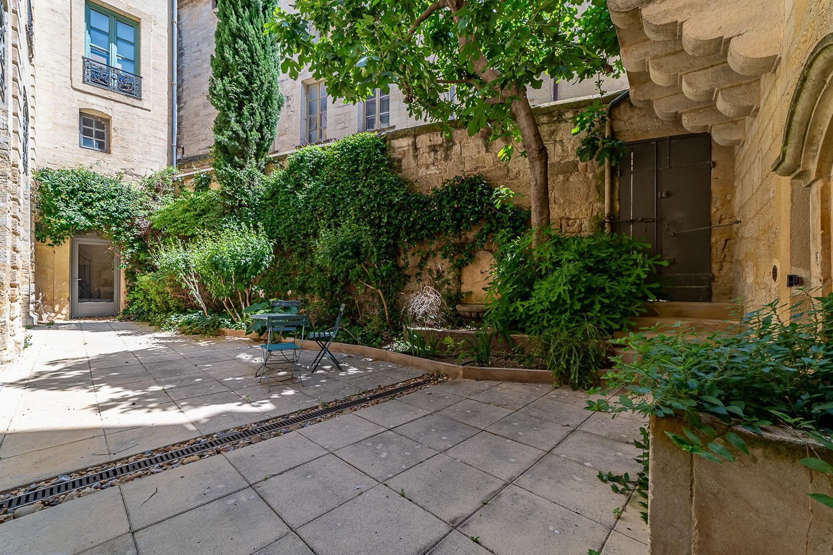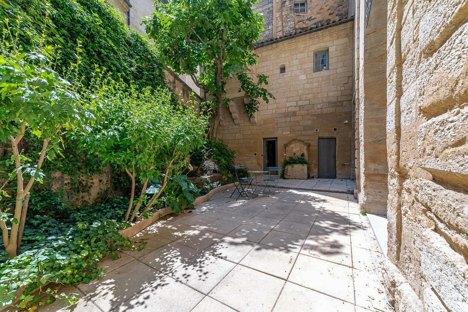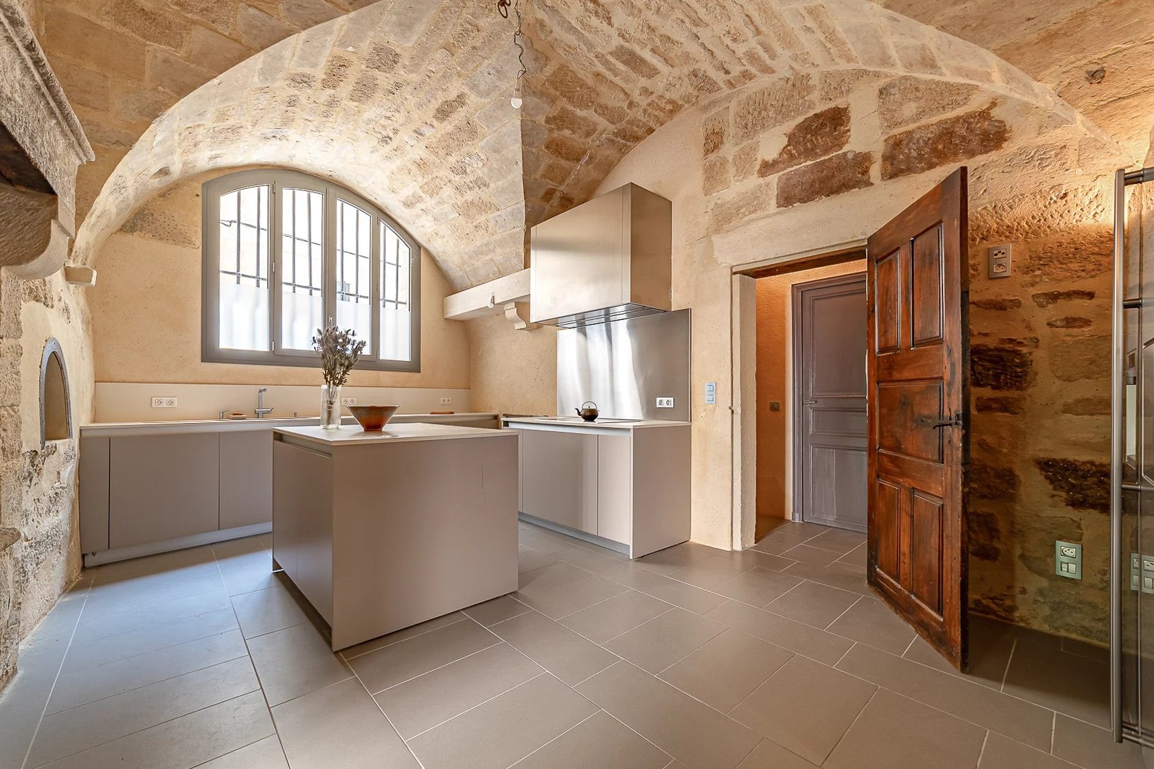 L'appartement dispose d'une entrée indépendante et s'ouvre sur un salon de 64 m² largement ouvert sur le jardin. La cuisine voûtée de style avignonnais comprend un espace dînatoire avec cheminée en pierre et four à pain, également orientée vers le jardin.