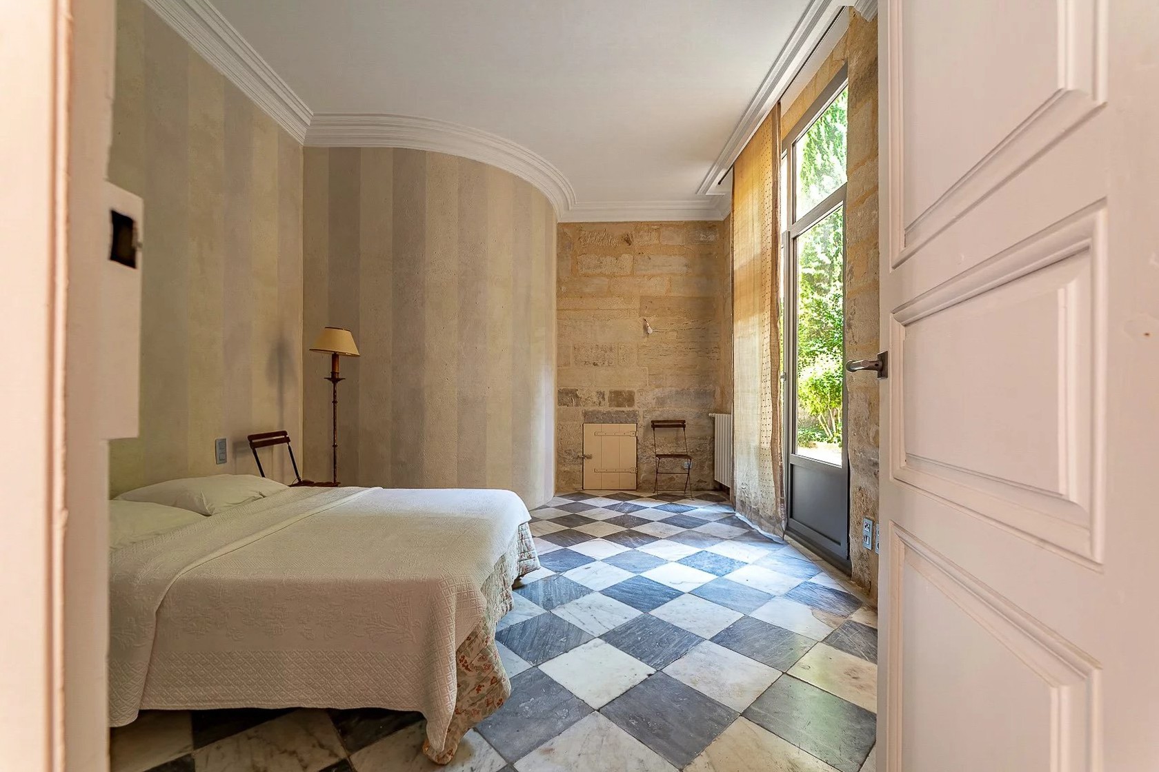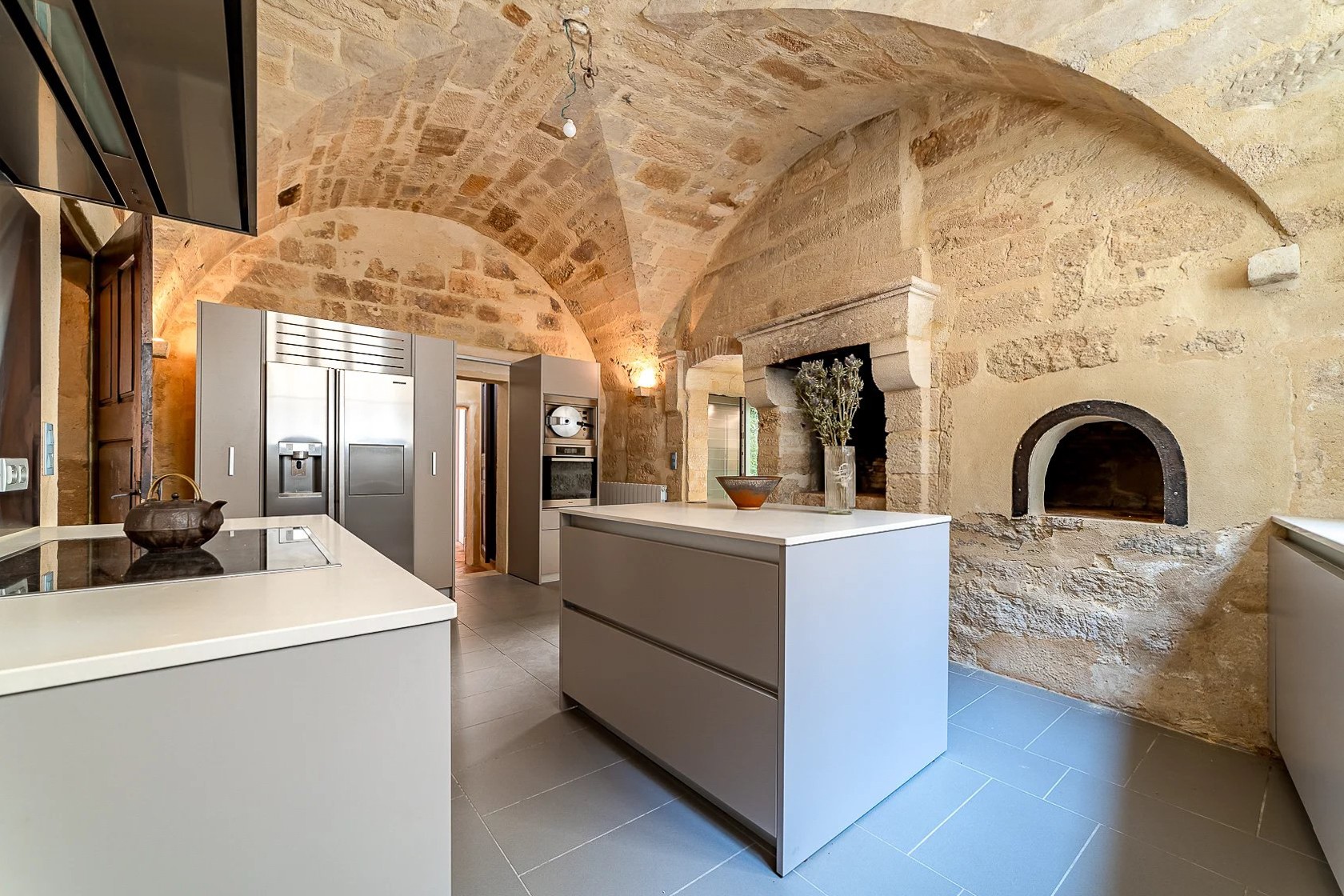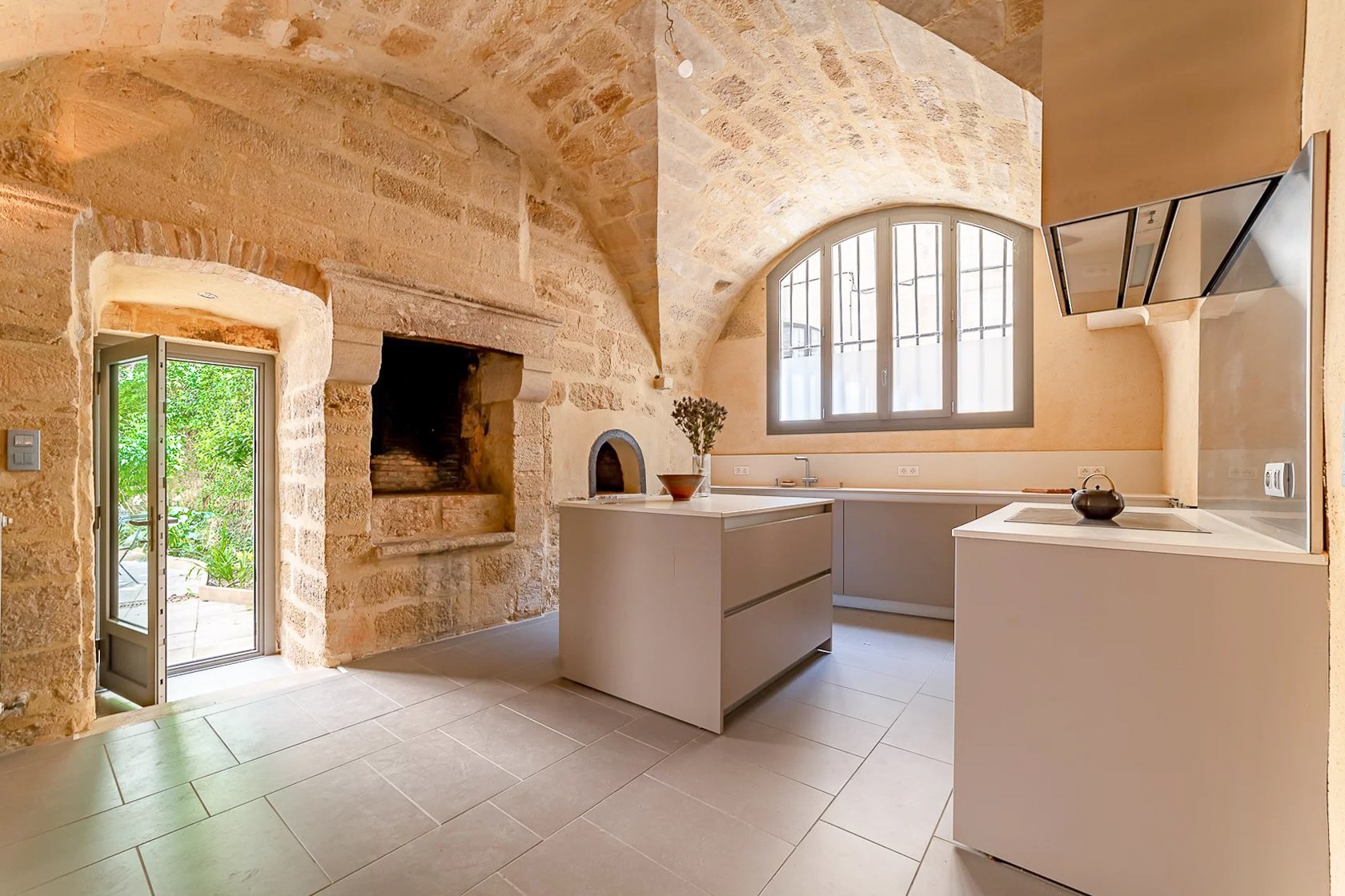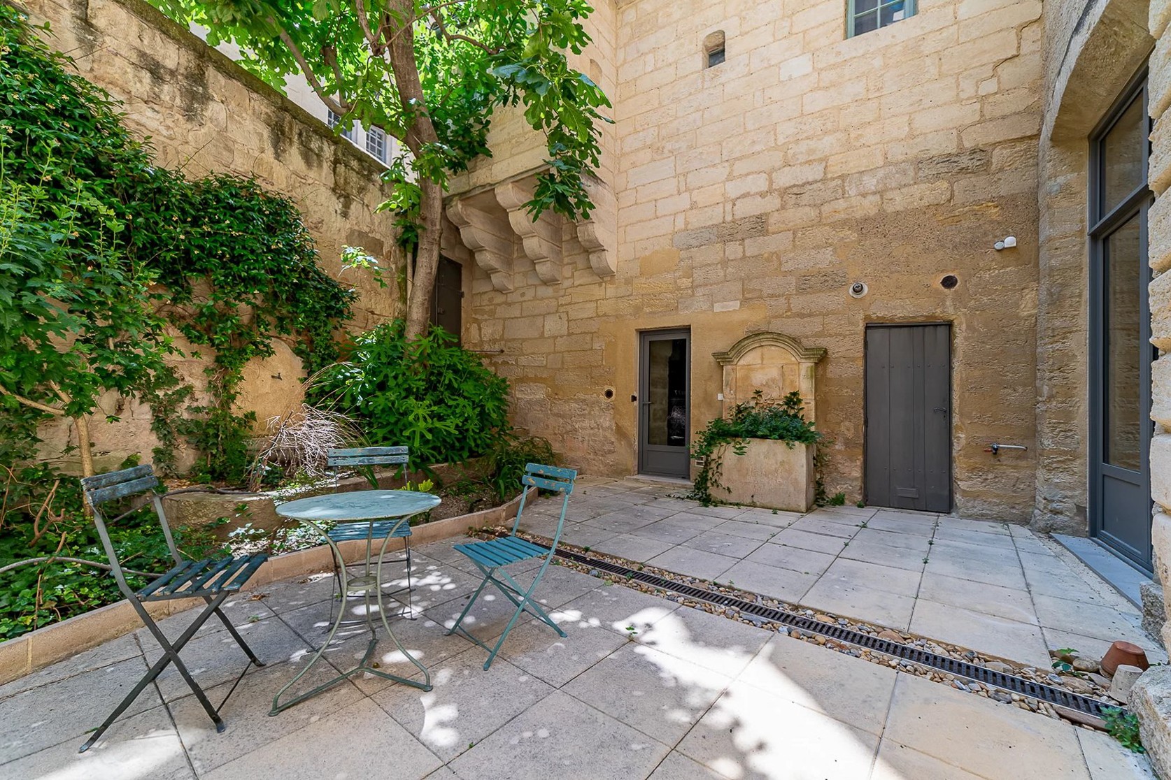 L'appartement dispose d'une entrée indépendante et s'ouvre sur un salon de 64 m² largement ouvert sur le jardin. La cuisine voûtée de style avignonnais comprend un espace dînatoire avec cheminée en pierre et four à pain, également orientée vers le jardin.