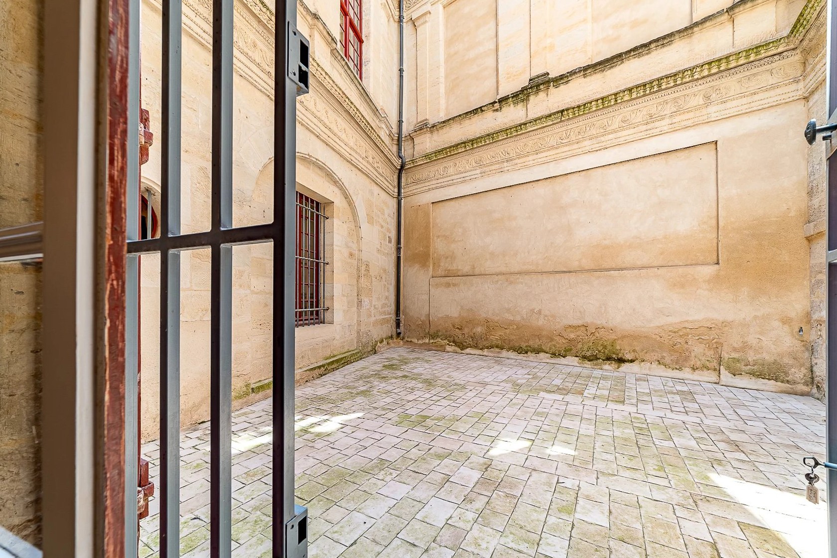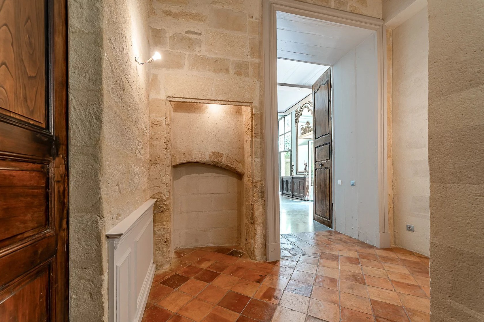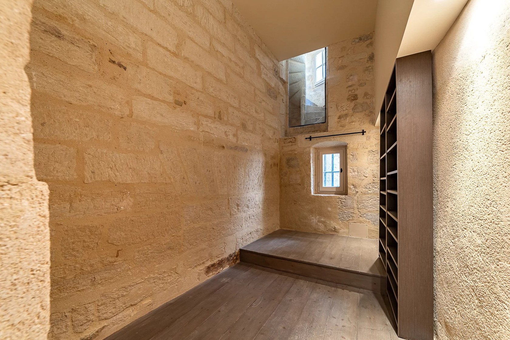 Les parties communes témoignent du caractère du lieu : pierre apparente, voûtes, boiseries anciennes, trumeaux, hauteur sous plafond de plus de cinq mètres.
