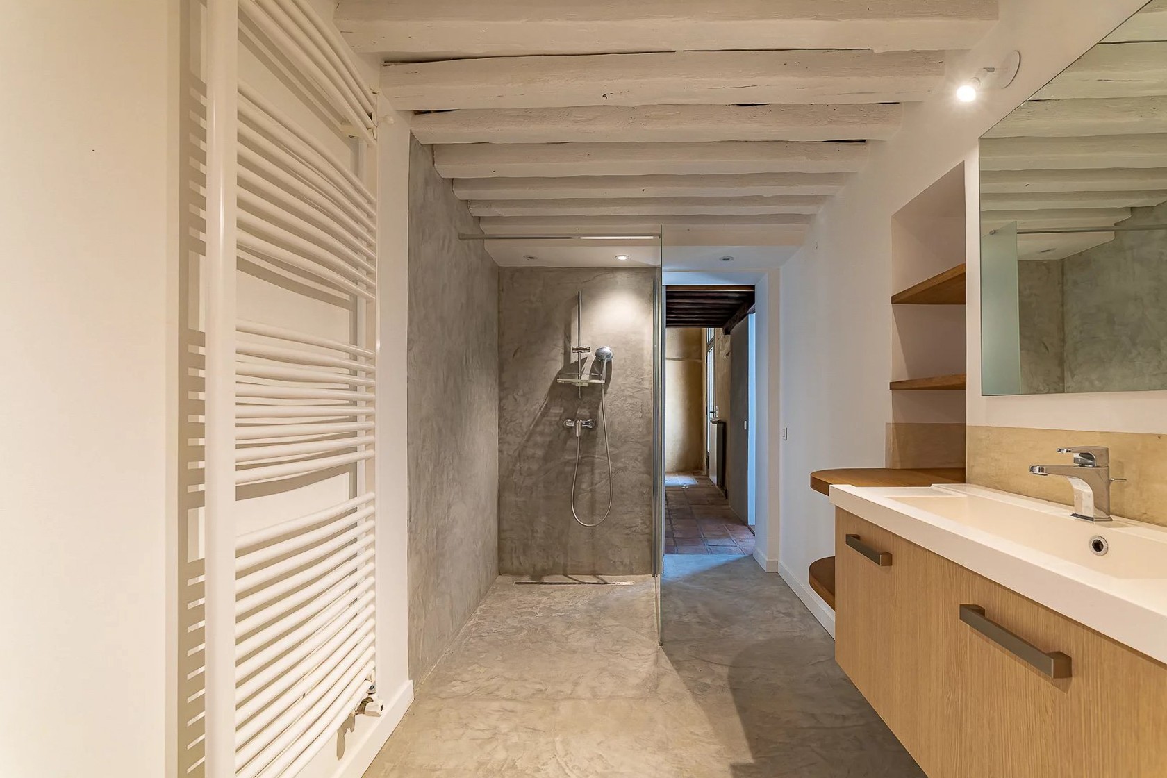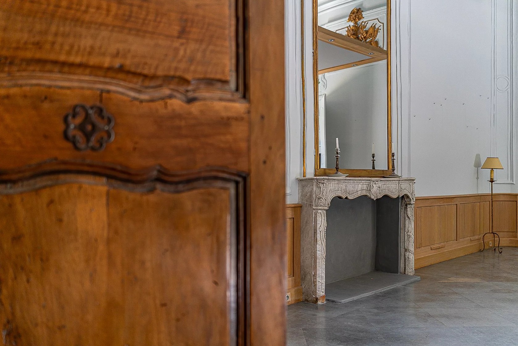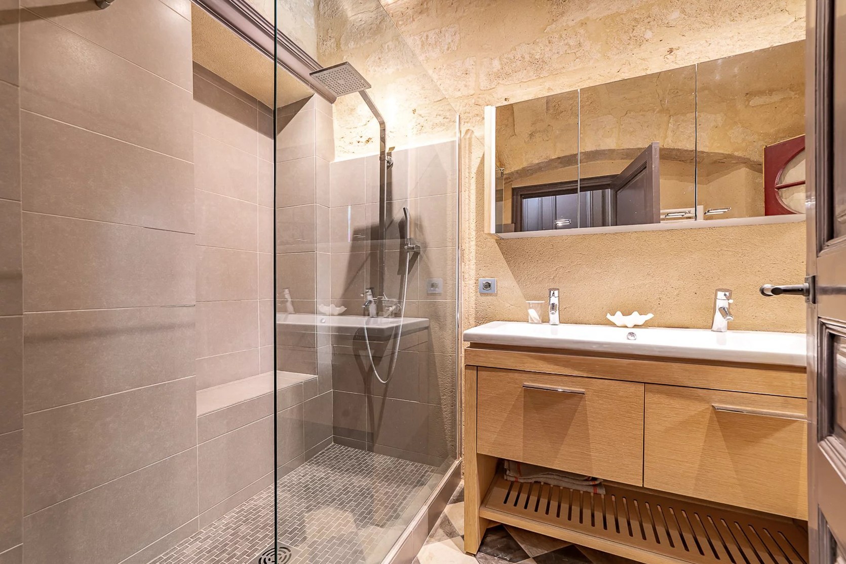 Les parties communes témoignent du caractère du lieu : pierre apparente, voûtes, boiseries anciennes, trumeaux, hauteur sous plafond de plus de cinq mètres.