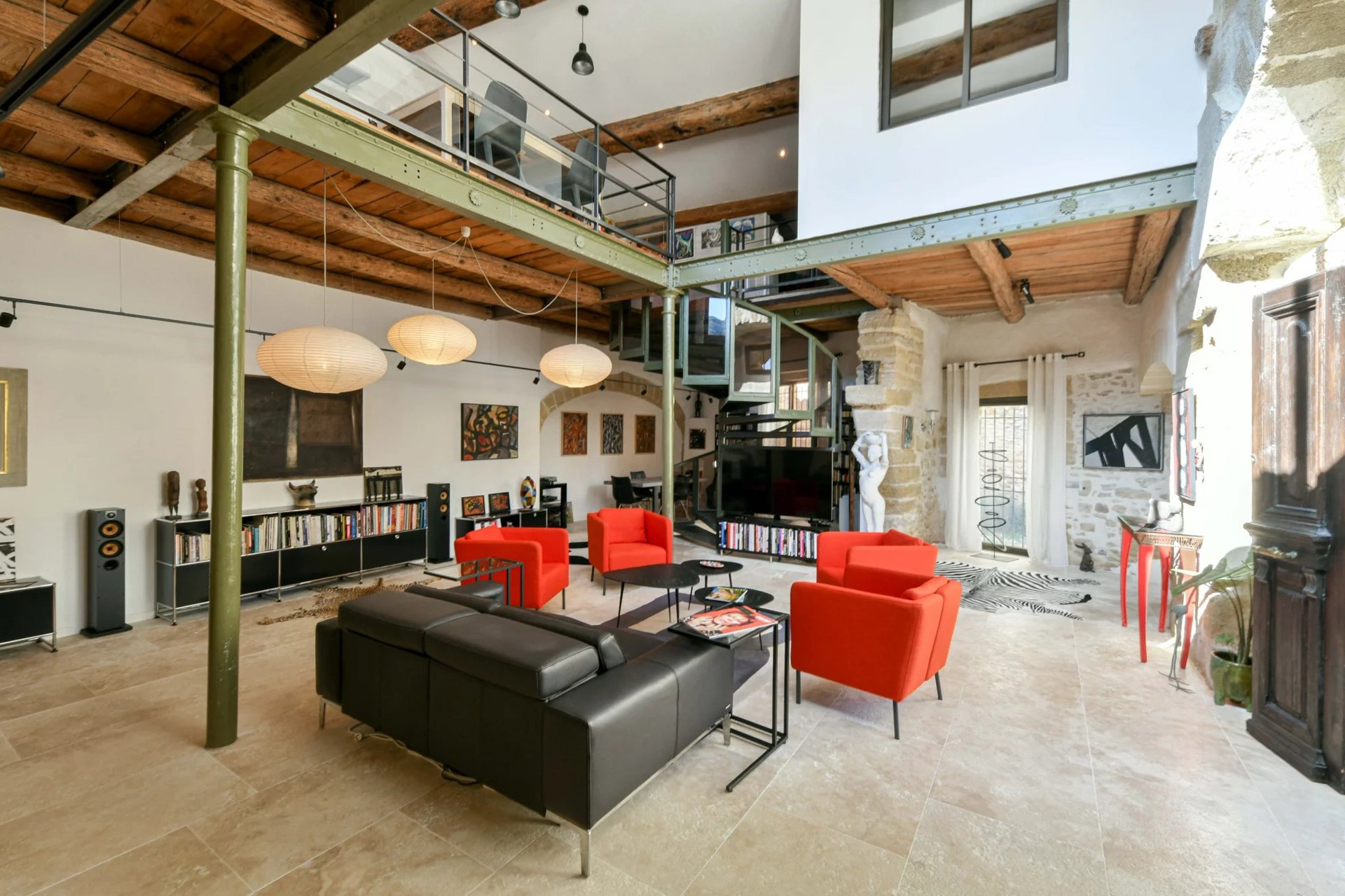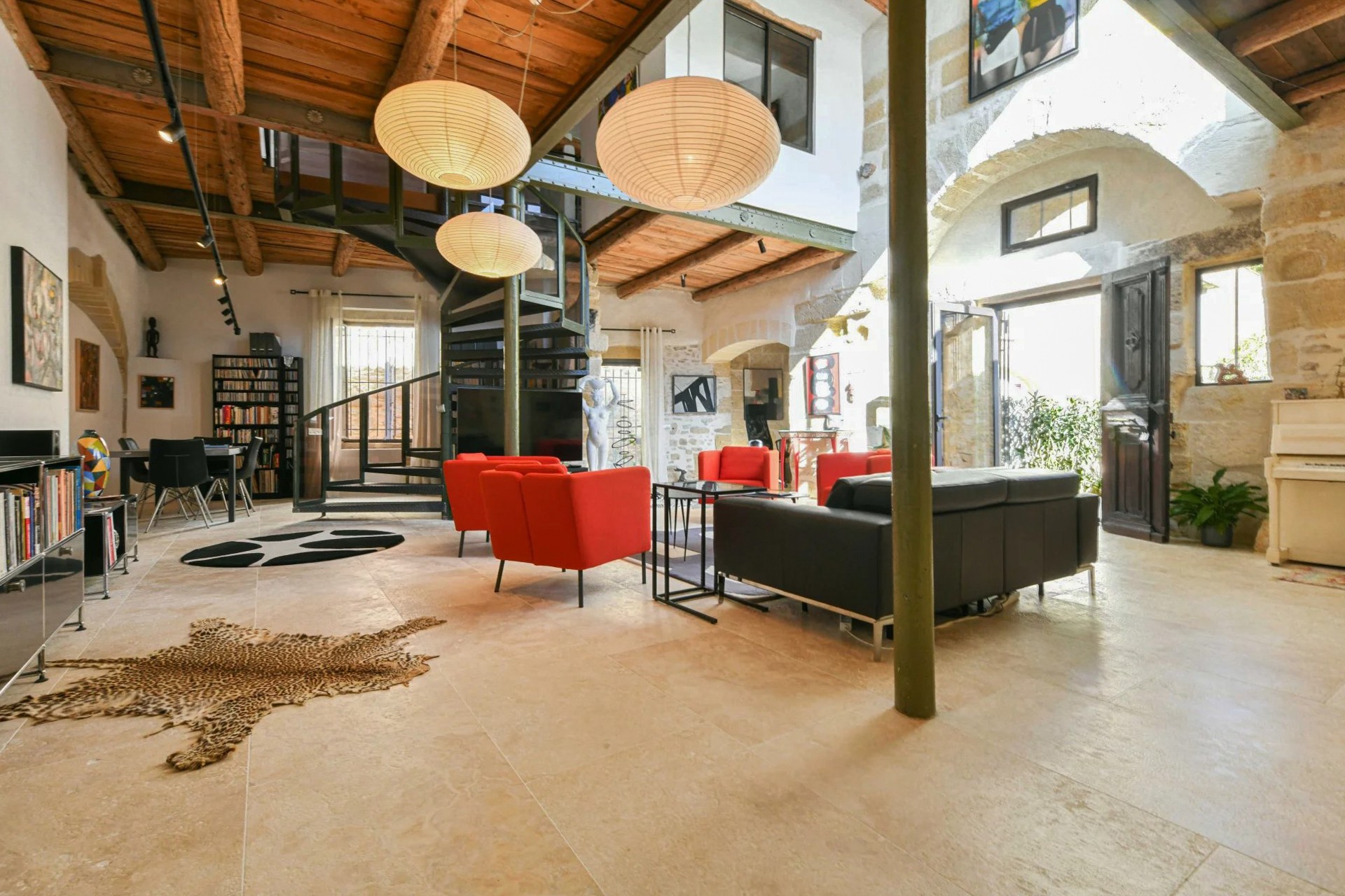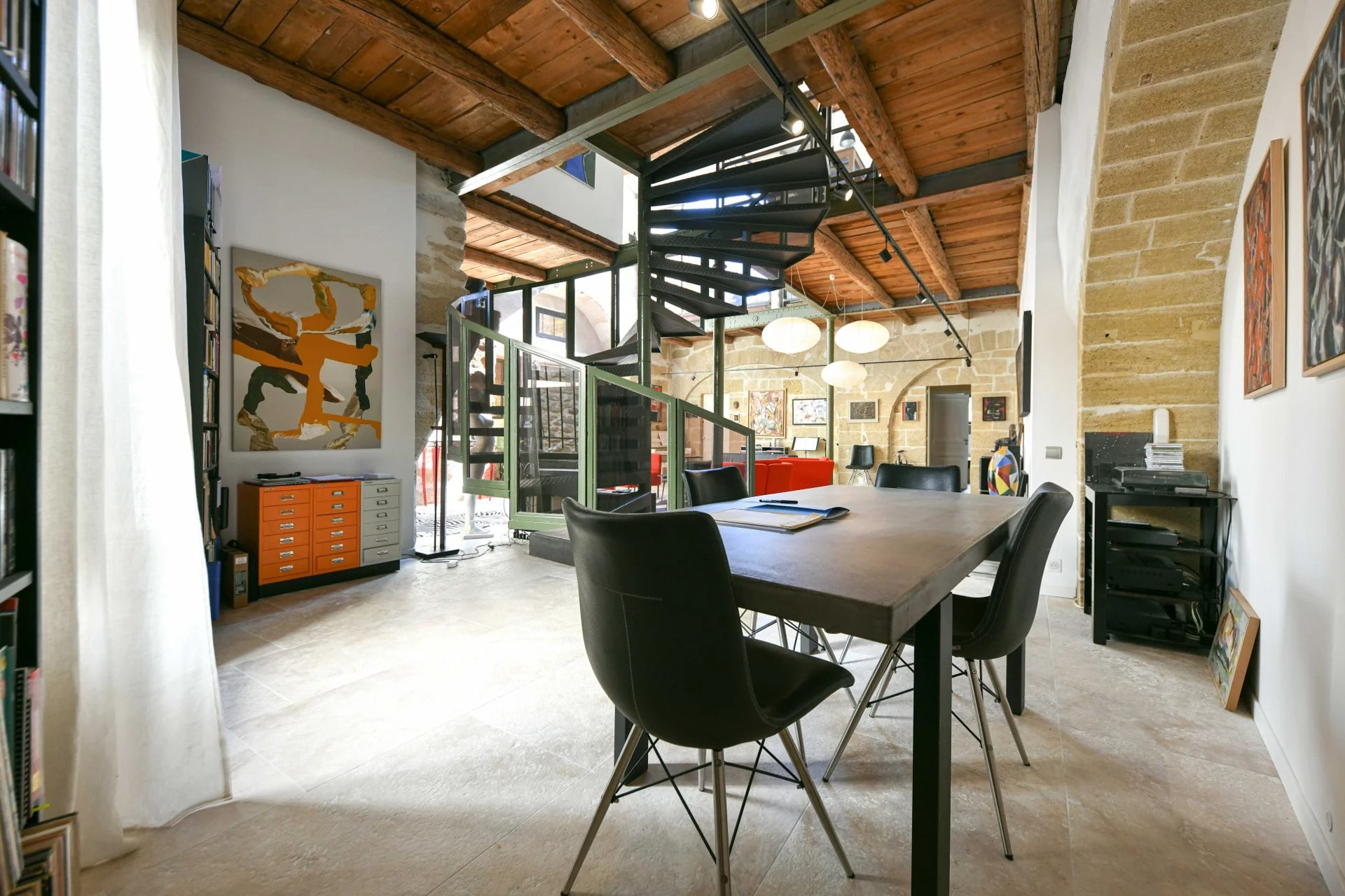 Ancien moulin à huile rénové avec volumes exceptionnels dans village avec commerces