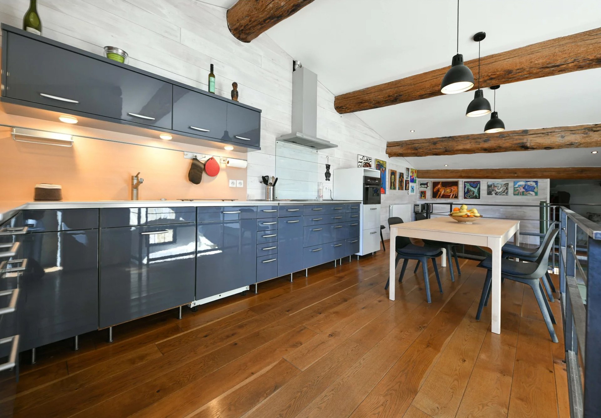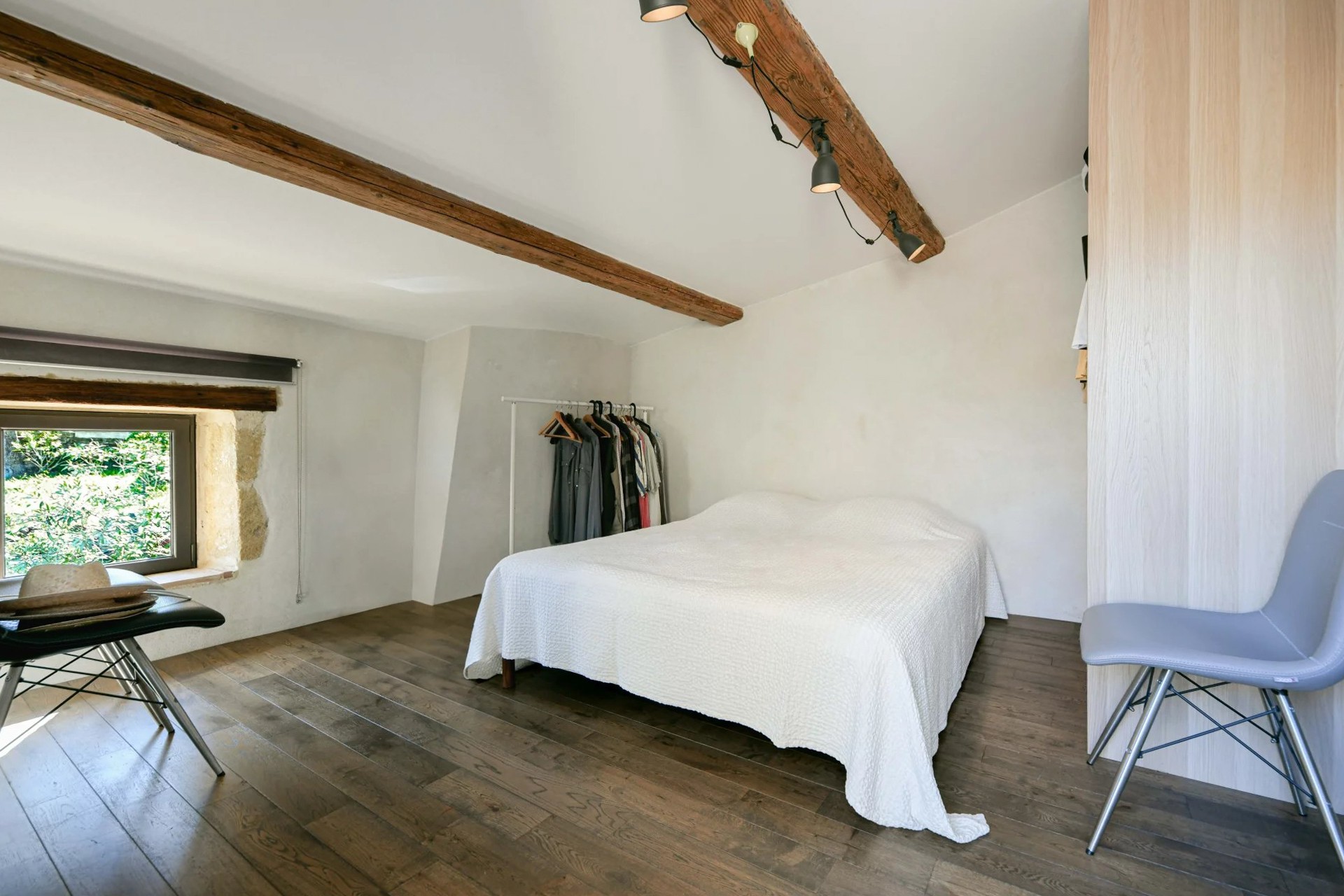 Un escalier confortable (marches larges et peu hautes) mène à l’étage. Le palier dessert une cuisine équipée et aménagée, lumineuse et ouverte sur la pièce de vie. Un second espace nuit comprend une chambre et un dressing.