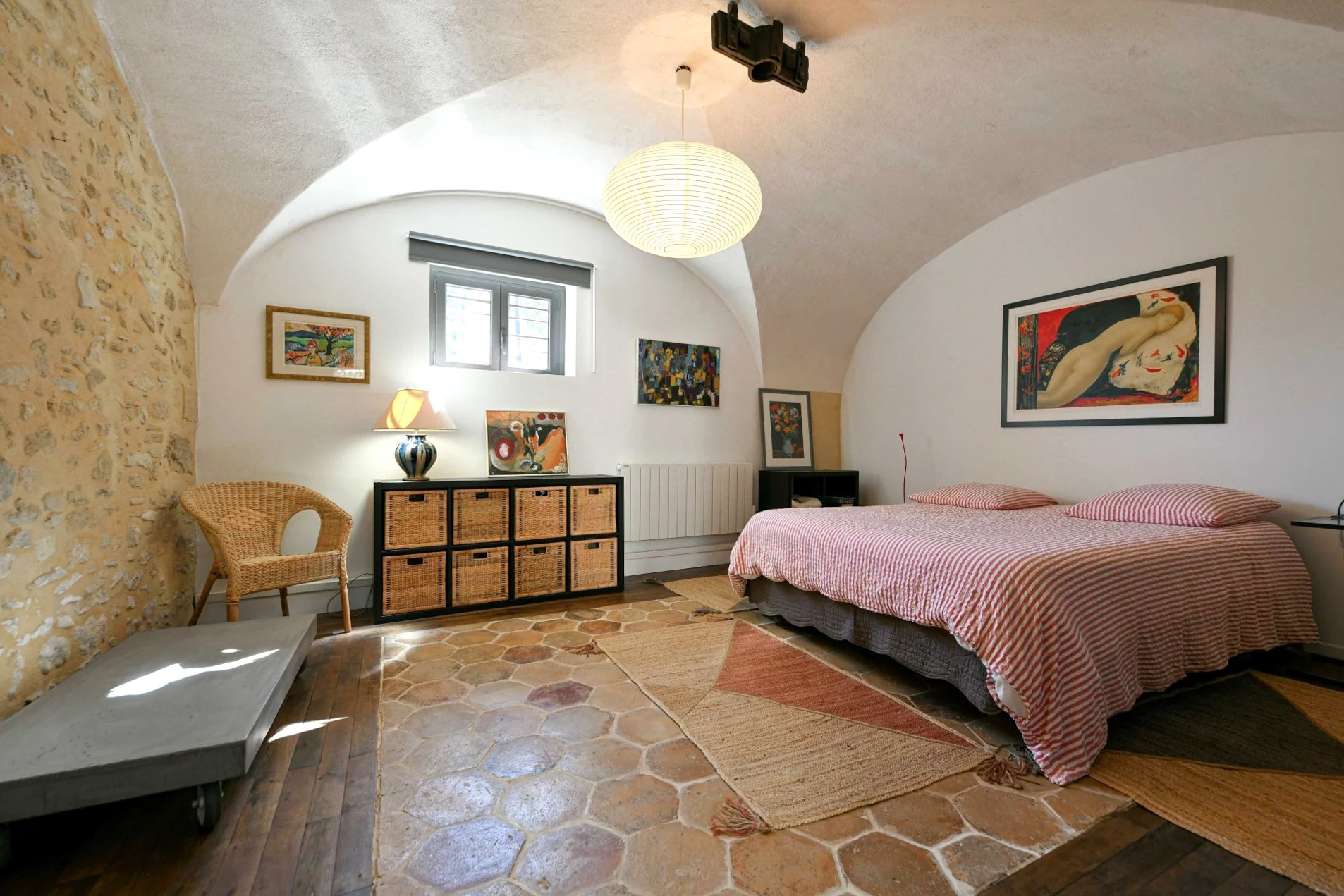 Au rez-de-chaussée, une pièce de vie à double hauteur comprend un salon cathédrale, une salle à manger et un espace bureau. Lumineuse, elle s’ouvre sur une cour fleurie. De plain-pied également, une chambre spacieuse ainsi qu’une grande salle de bains avec baignoire, douche à l’italienne et vasque. Toilettes invités séparées.