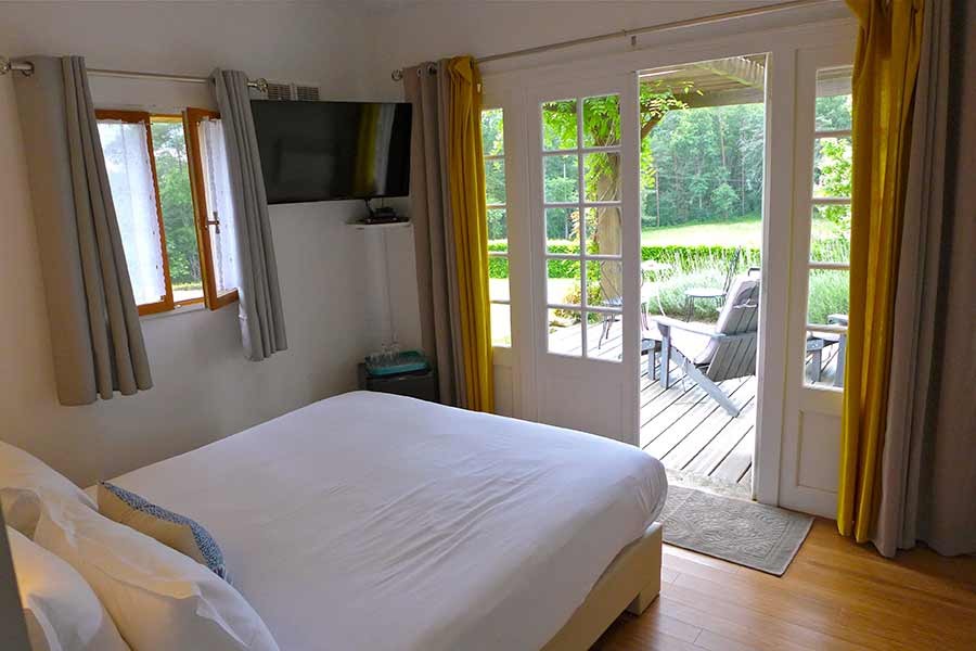 Ground Floor: A period wooden door opens into the hill which has stone floors and exposed stone walls. To the right is a newly equipped kitchen with two doors opening onto the south facing terrace with stunning views and a pretty wrought iron pergola to provide shade. The kitchen also has stone floors and walls and wooden beams and has a professional “La Cornue’ gas and electric range as well as a second electric cooker. =Laundry & Utility room & a W.C. Lovely original stone staircase leads to: