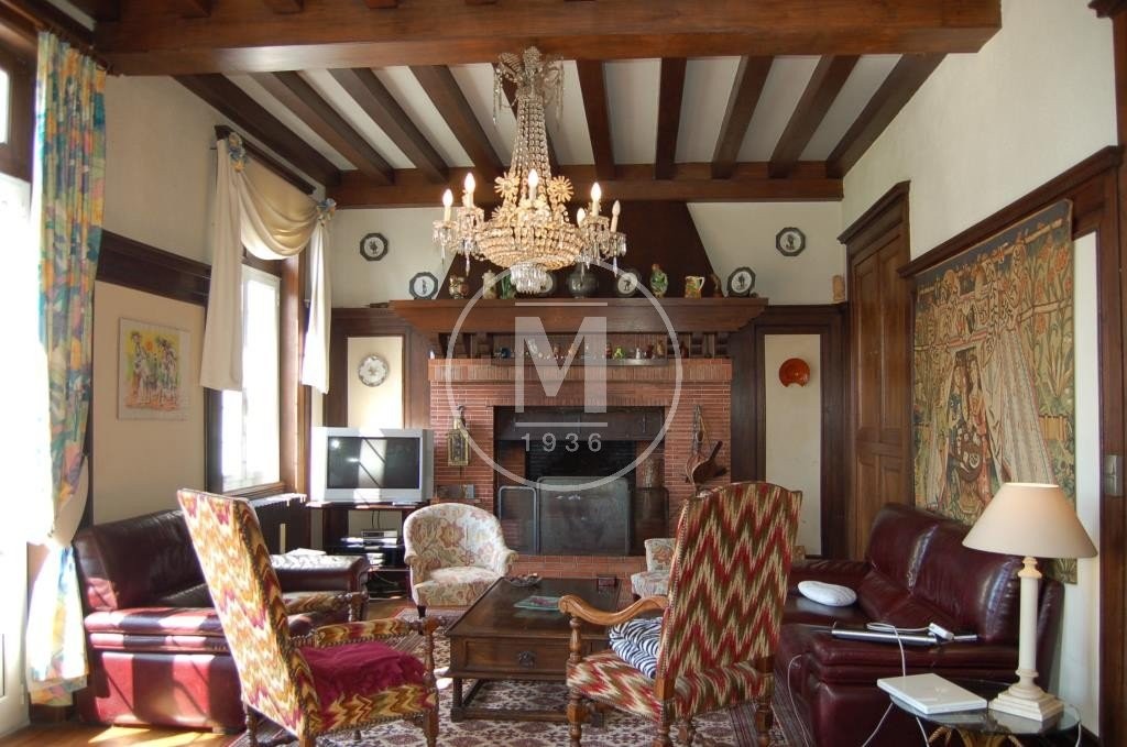 Grand séjour de 45.33m² (parquet chêne /poutres apparentes /murs avec parement bois /placards ouvrant sur office /grande cheminée ouverte /HSP 3.25m), porte-fenêtre sur terrasse et parc Sud