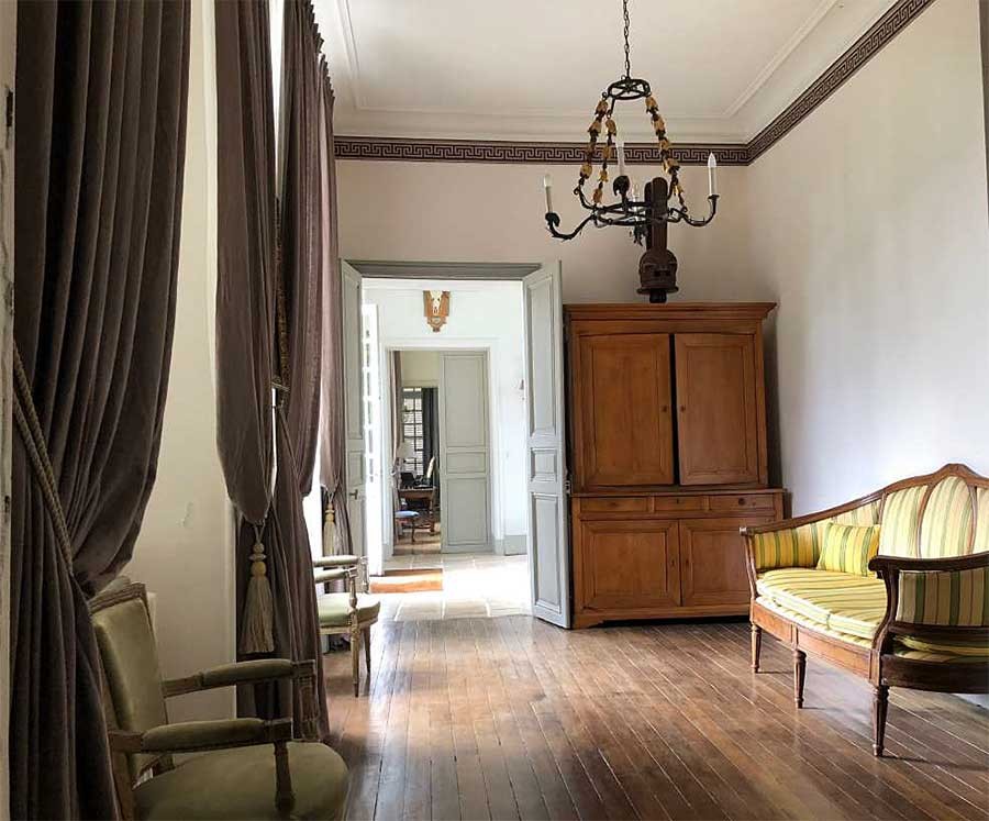 A bright entrance hall can be entered on either side by two small paned french windows. Original flagstone floor and ceiling height of 4.80 metres. To the left, a Salon of 40m2 is ready to welcome guests with herringbone parquet in very good condition, lit by four large windows. Two double doors open onto two smaller Salons. One could become a study and one, a library with a small stone fireplace - a small bright living room opening onto the garden.