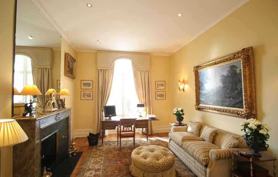 Ground floor: Entrance hall with original tiled floor and oak staircase. Salon 110m2 with marble fireplace and oak parquet floor, Double french door to balcony. Dining room with ornate marble fireplace and oak parquet floor, Study, Kitchen /breakfast room, scullery, home entertainment room with Sauna, billiard and home cinema.