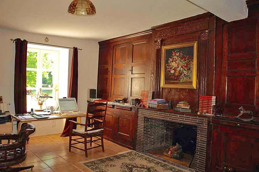 Sitting/dining room, exposed oak beams, large wood burning stove installed in 'walk-in' fireplace; Library with wood panelled bookcase and a central open fireplace; Kitchen: fitted units for oven, hob, and microwave. Full height fridge/freezer and dish washer; Utility room: oil-fired C.H. boiler (Viessmann), washing machine; Lobby area leading to staircase. Back door opening onto cobbled courtyard with a covered al fresco dining area; Oak spiral staircase to upper floors; WC under the staircase.