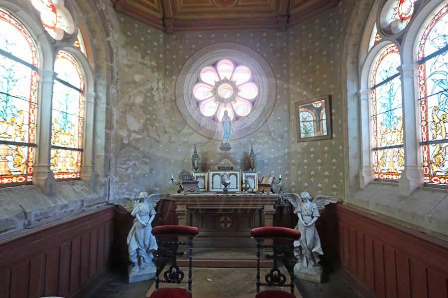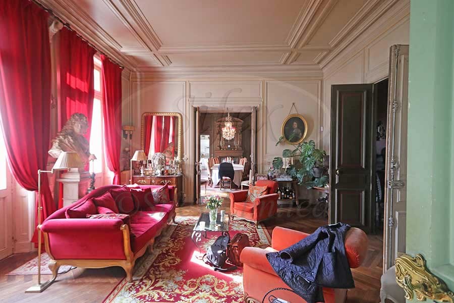 Beautiful ornate hall with wooden steps and floor, decorated beamed ceiling, study, bedroom, small and large Salons, dining room, a former study converted into a kitchen, W.C. Adjoining the Chateau on the ground floor and accessible from inside is a charming chapel, with beautiful stained glass windows.