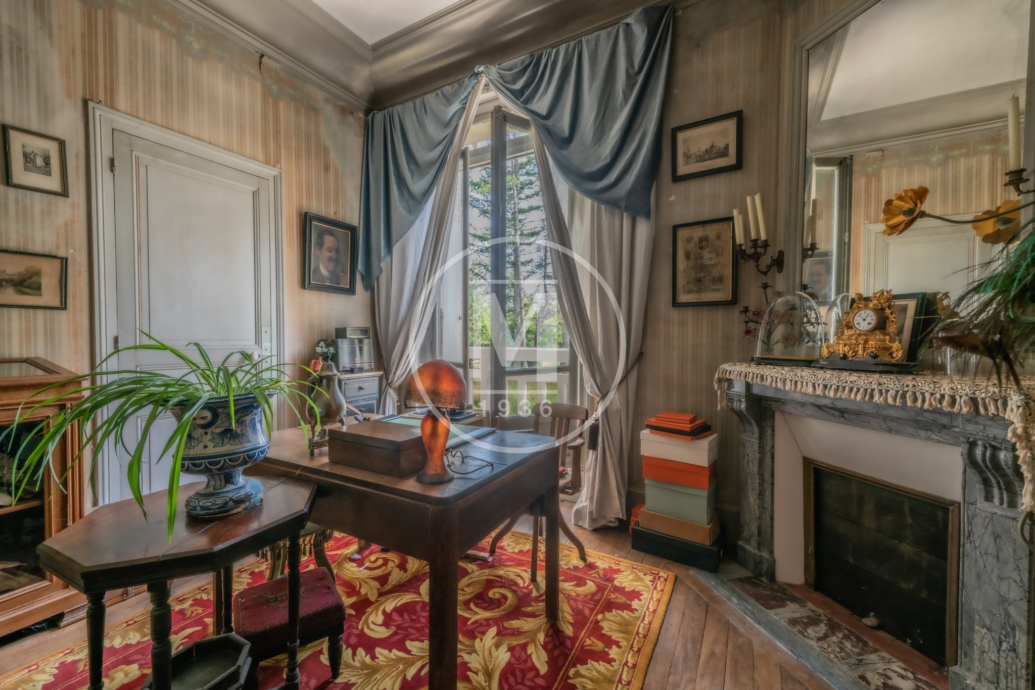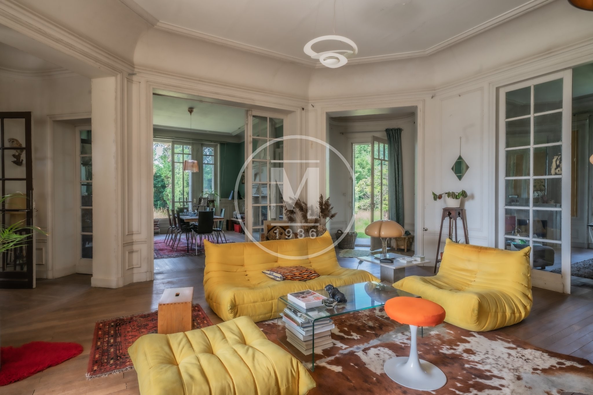 Un double escalier en façade principale arrive sur une terrasse avec des colonnes. L’entrée donne sur un grand salon qui se prolonge en enfilade par un bureau/ petit salon.