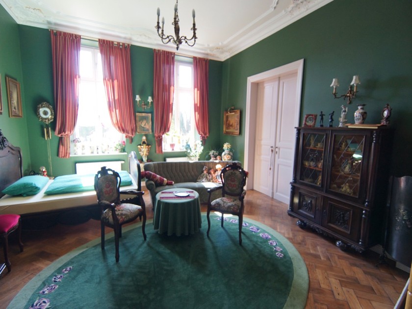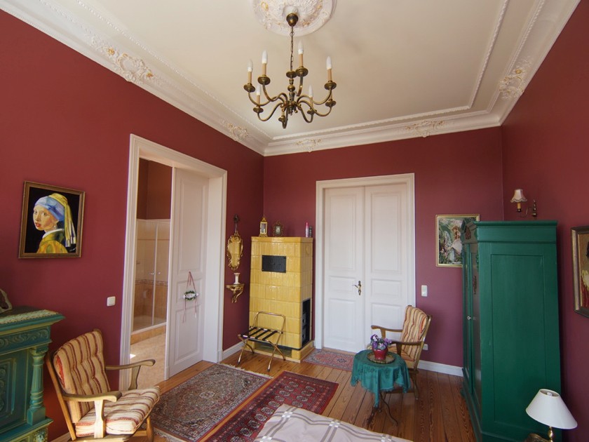Der wunderschön aufgearbeitete Stuck und die teilweise Glasmalerei unterstreichen historischen Charakter des Objektes. Die Fußböden sind mit aufgearbeiteten Holzdielen, Fischgrätenparkett oder Fliesen versehen.