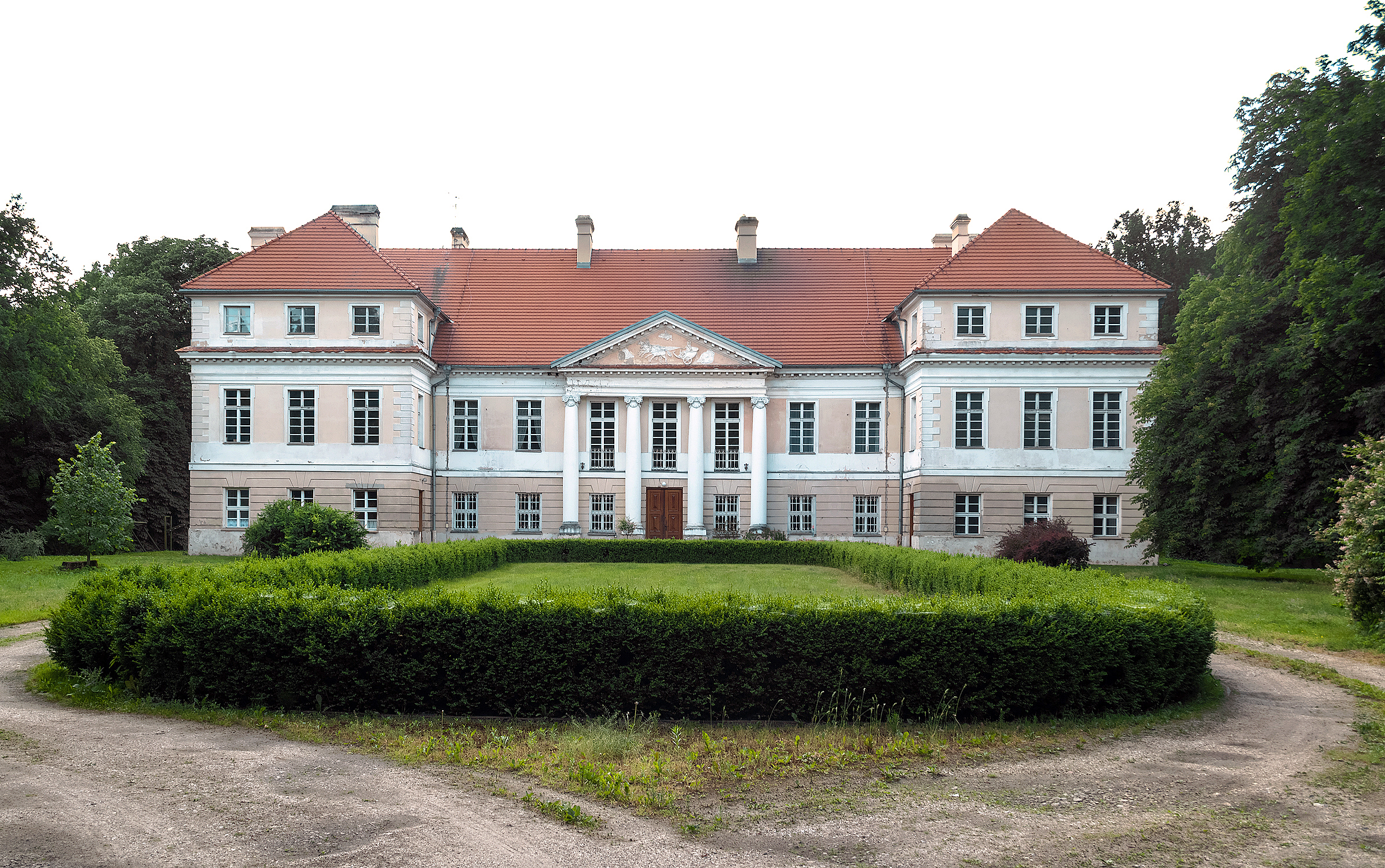 Le palais de Siedlec, à l’est de Poznań, est considéré comme l’une de ses œuvres majeures et illustre la transition du baroque au style classique. La construction débuta en 1770 à la demande d’Antoni Krzycki, mais l’édifice ne reçut sa forme actuelle qu’à partir de 1790, portant la signature architecturale distinctive de Kamsetzer. Le palais présente un plan en U avec deux courtes ailes latérales à mezzanine et un risalit central à colonnes surmonté d’un fronton triangulaire, où est représenté un relief d’un char romain tiré par trois chevaux. Le rez-de-chaussée bas abrite le hall, tandis que les salles de réception se trouvent à l’étage supérieur.